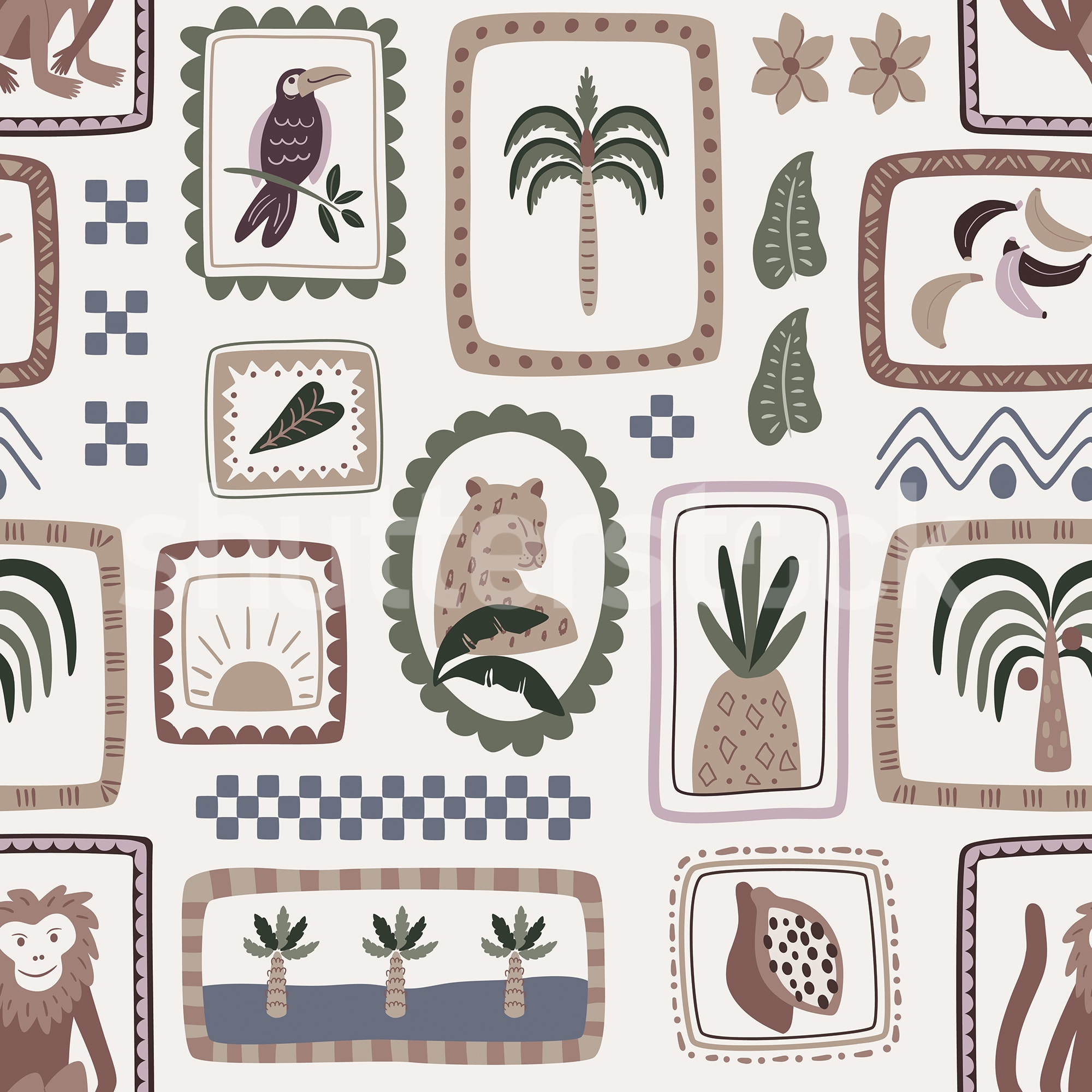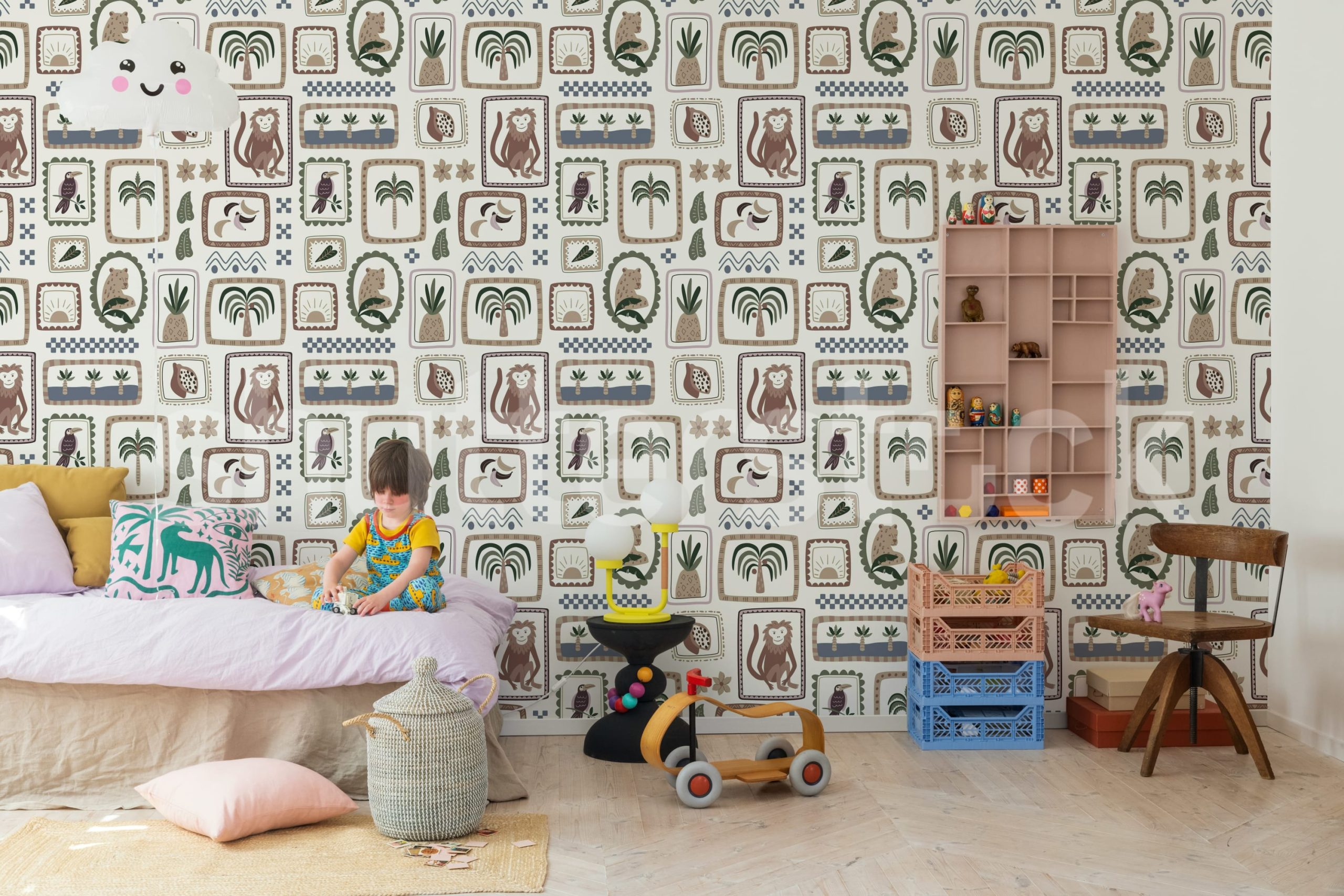 Adaugă un aer exotic cu acest tapet! Un design vintage cu ilustrații de junglă înrămate, ideal pentru camera copiilor. Creează un spațiu plin de aventură și culoare!