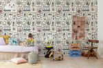 Fototapetul 3D personalizat Woodcut, CMYK, din colecția Rebel Walls, cu litere dispuse aleator, poziționate parcă în relief, oferă senzația de