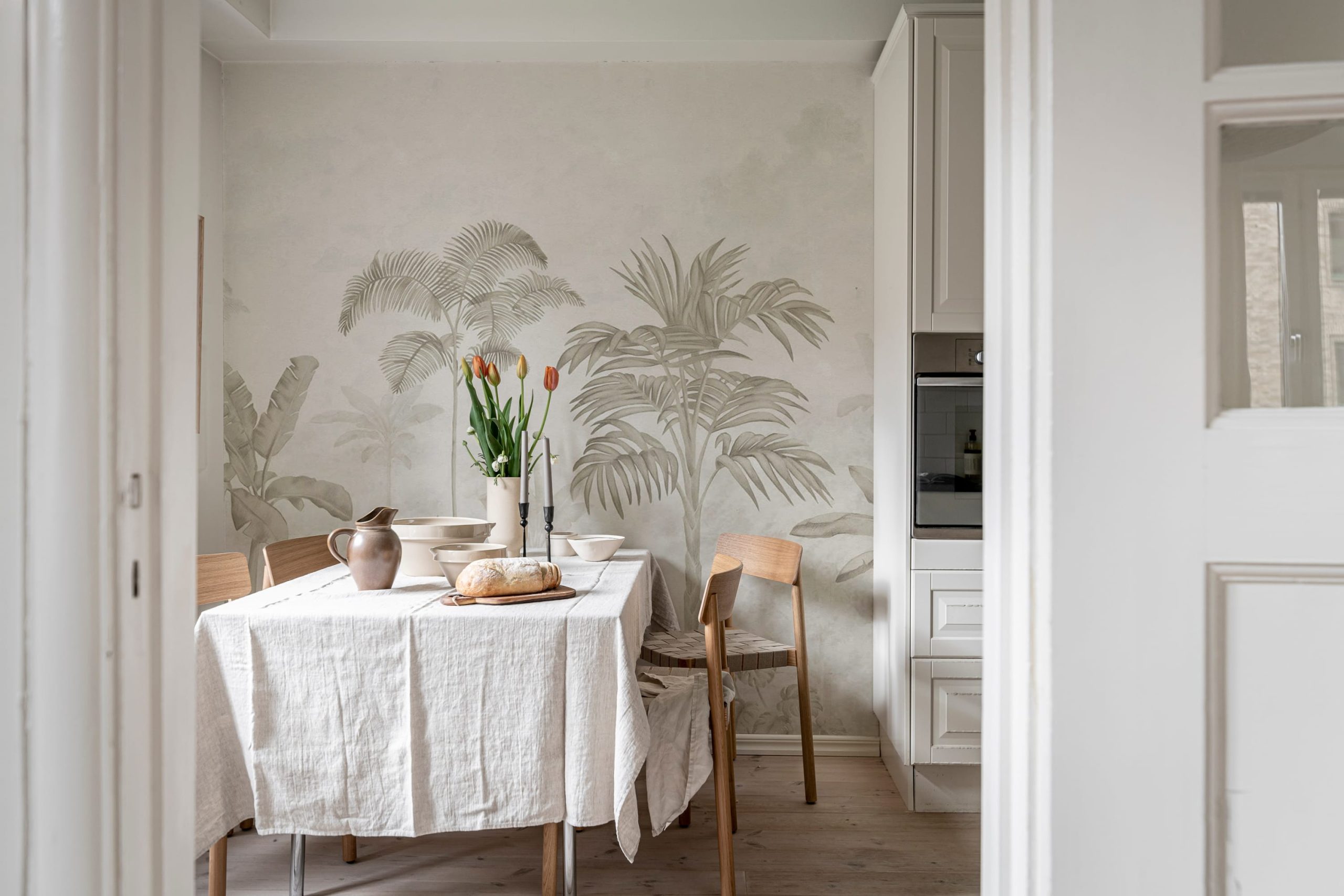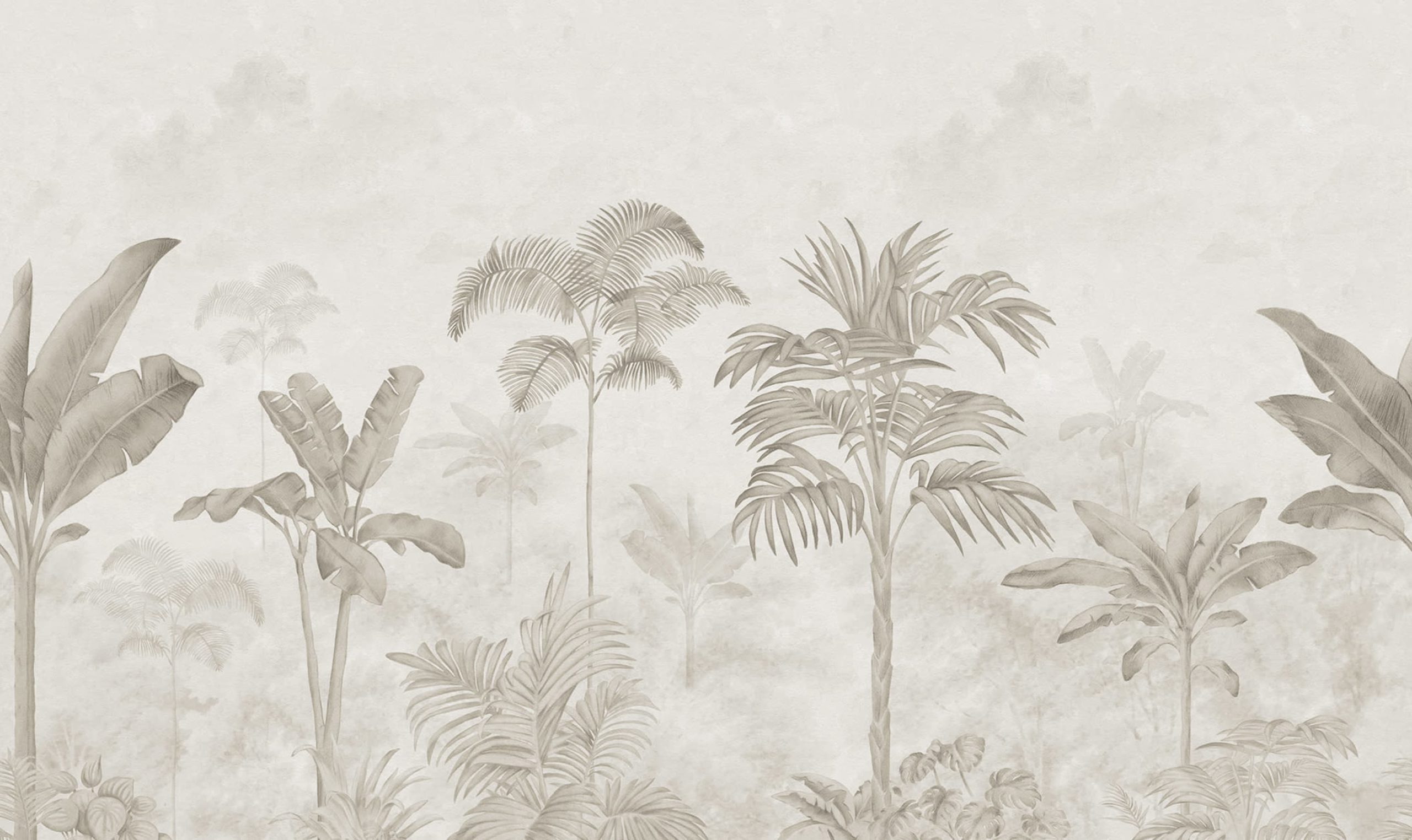 Odihnește-ți privirea asupra acestor palmieri eleganți aflați în jungla mistică și densă. Un mural zen care oferă spațiului tău o atmosferă frumoasă și sofisticată. Gama de culori Beige vine în nuanțe plăcute, moi de bej.