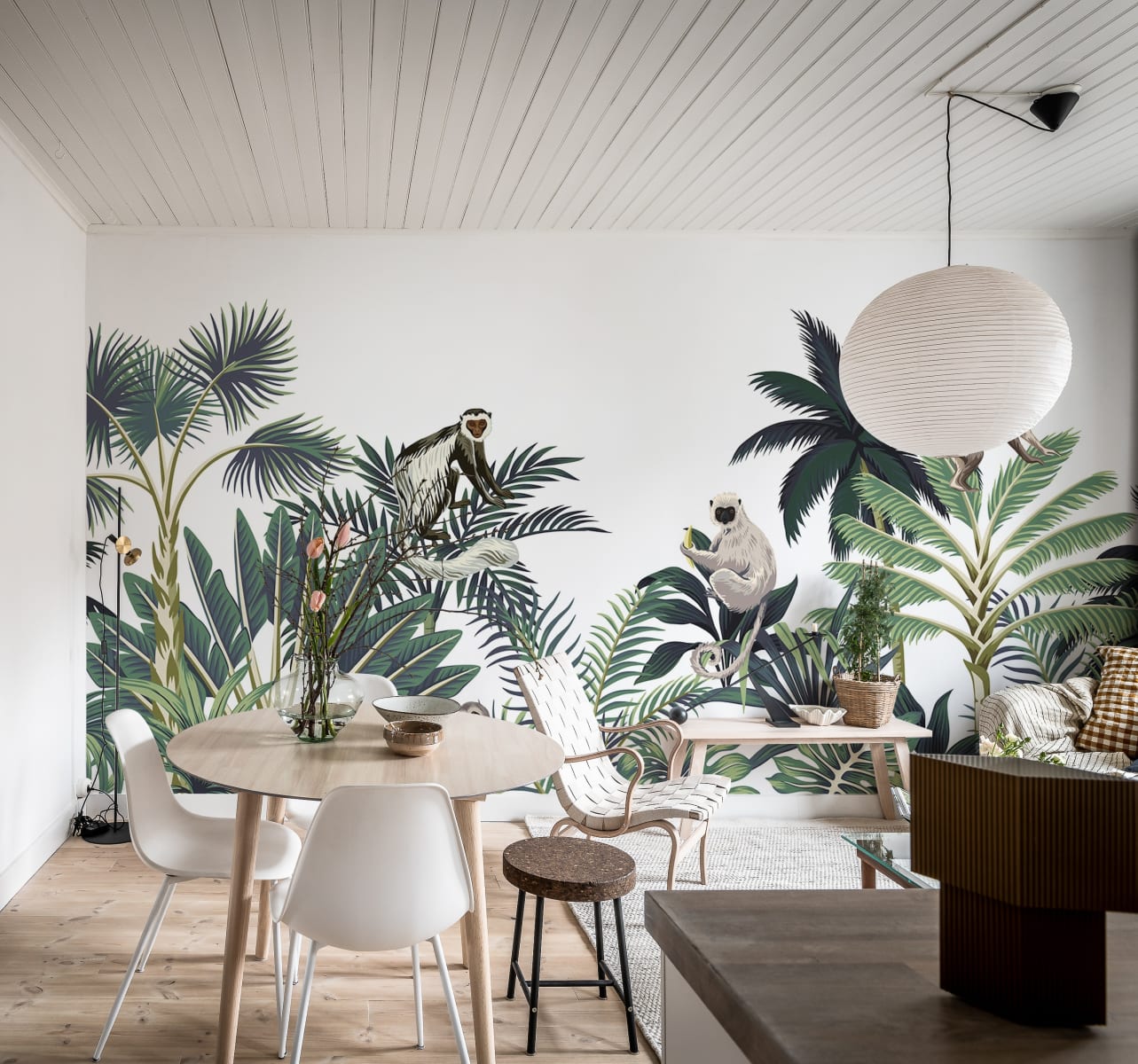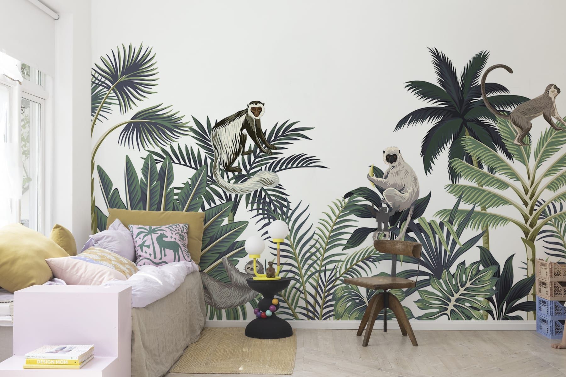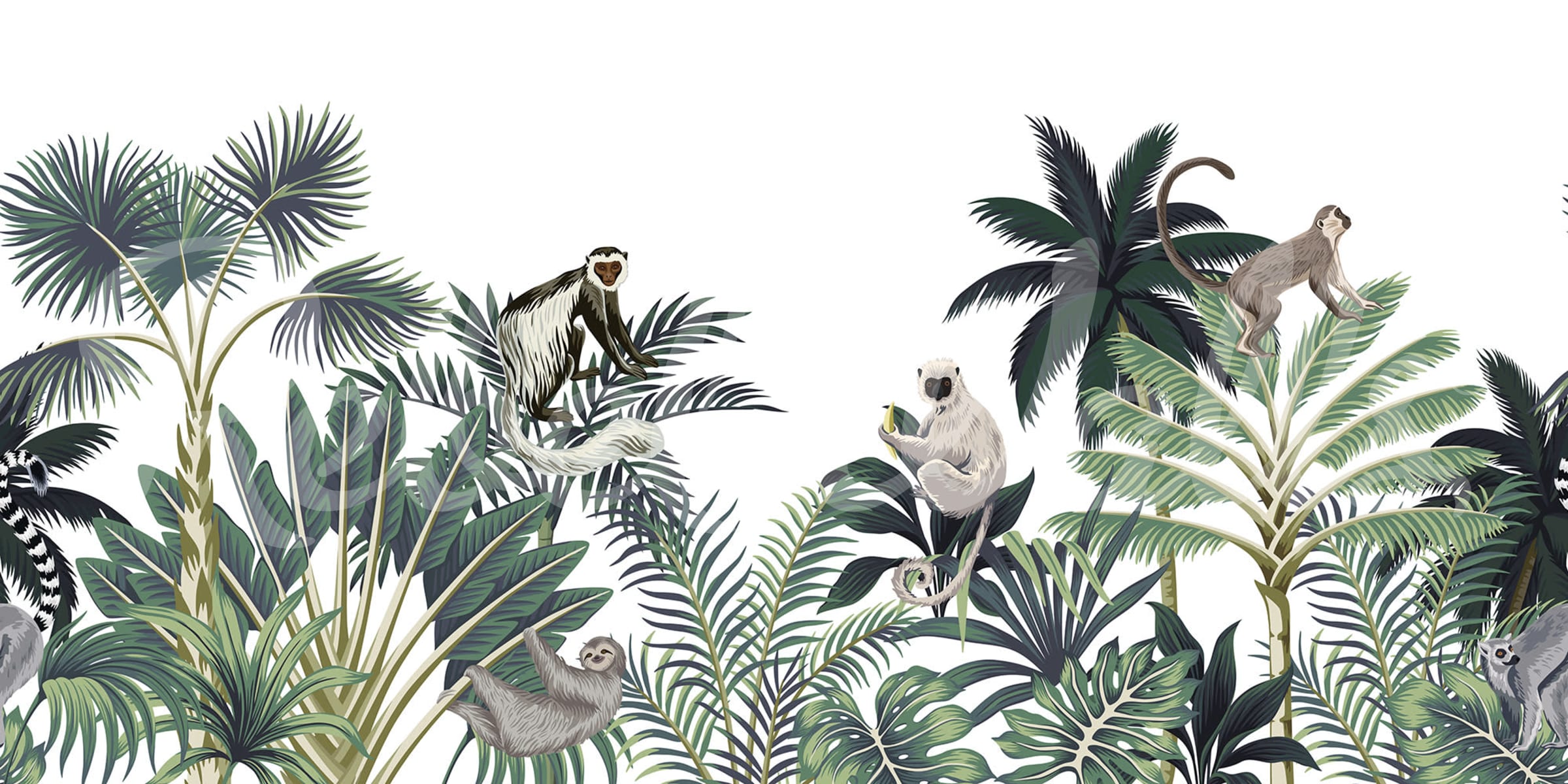 The Jungle Monkeys, White te transportă într-un paradis tropical. Jungle Monkeys înfățișează o noapte tropicală plină de ilustrații vintage cu palmieri, bananieri, plante și scene vesele cu maimuțe sălbatice, un leneș și un lemur, adăugând o atmosferă exotică și misterioasă oricărui spațiu.