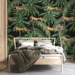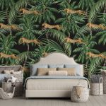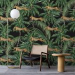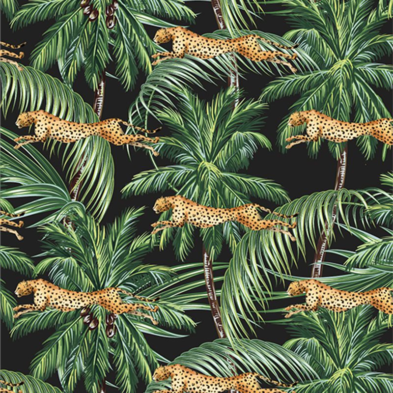 Jungle pattern tapet, VLAdiLA, featuring cheetahs leaping through lush palm trees on a black background. This stylish tapet will add a touch of exotic flair to any room. The vibrant colors and bold design will create a dramatic and captivating focal point. Perfect for bedrooms, living rooms, or even a home office, this tapet is sure to make a statement. The high-quality material is easy to clean and maintain, ensuring your tapet remains beautiful for years to come.