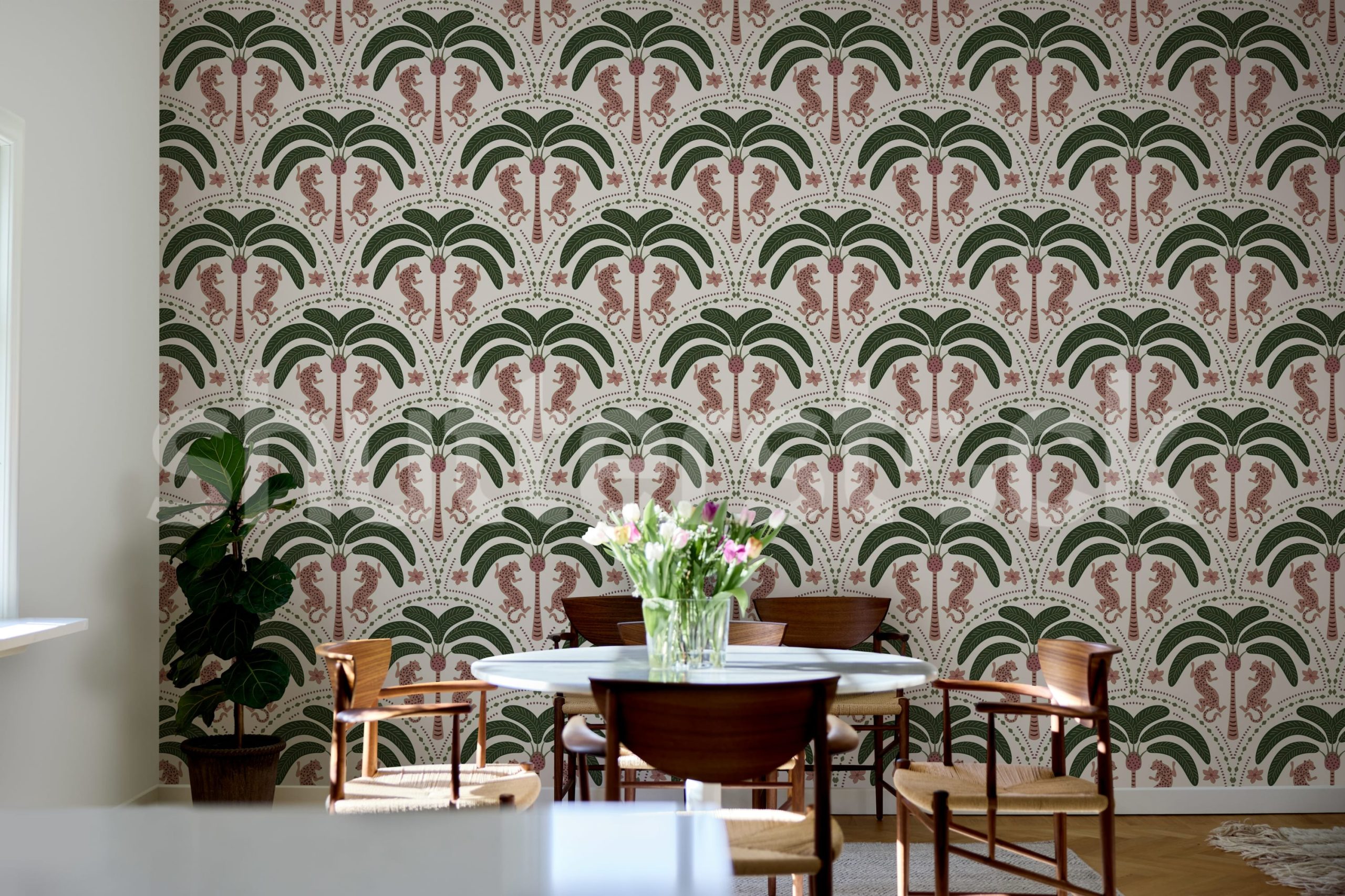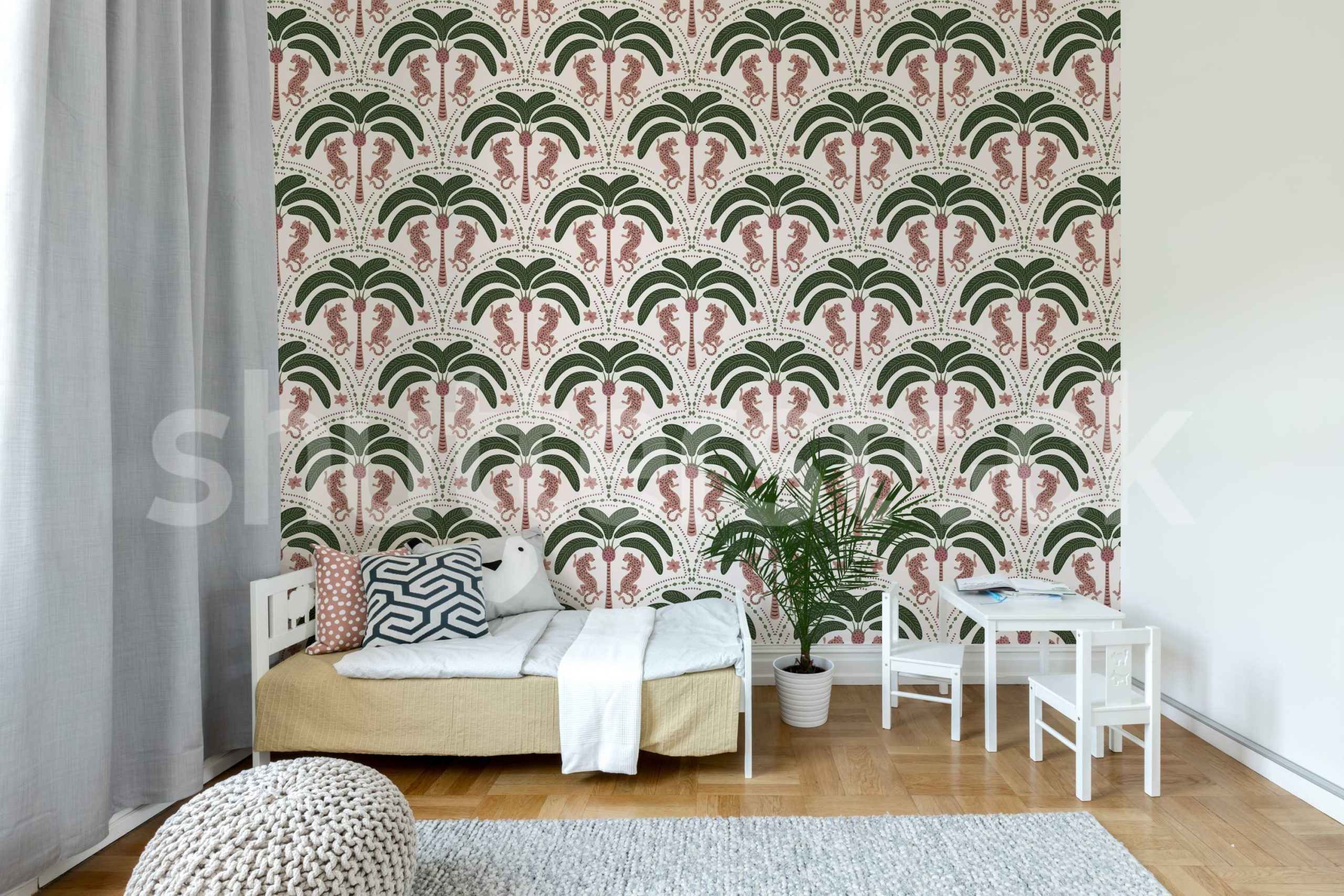 Adaugă o notă exotică cu acest tapet vibrant. Perfect pentru camere de copii sau spații creative. Design cu motive jungle și detalii roz.
