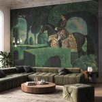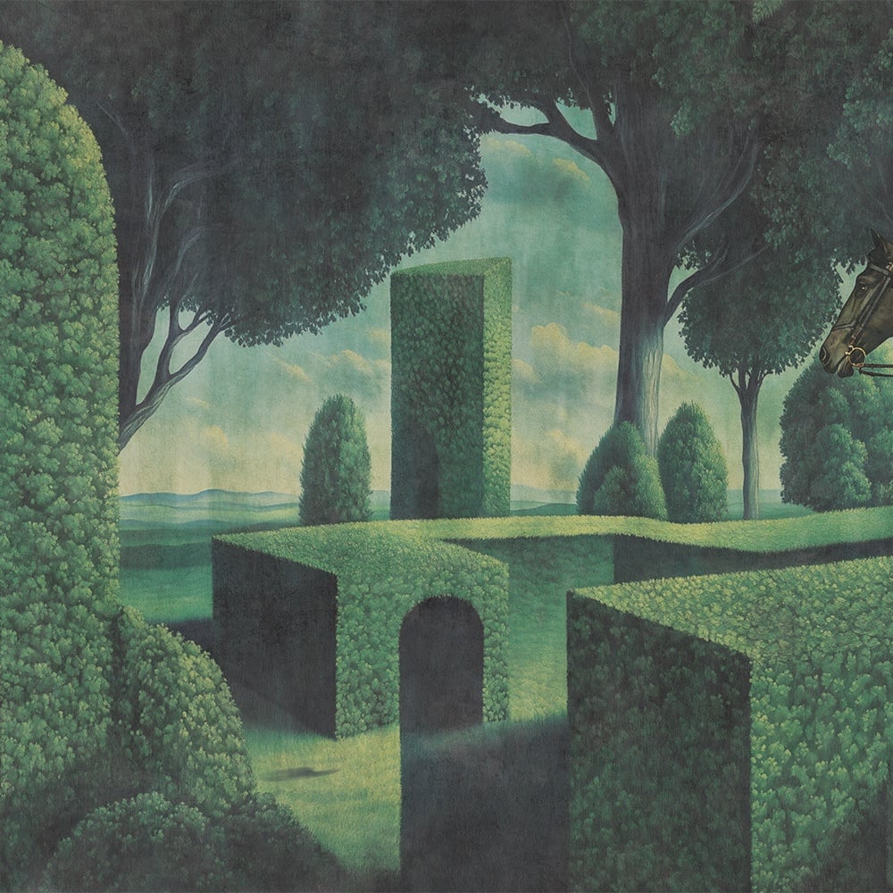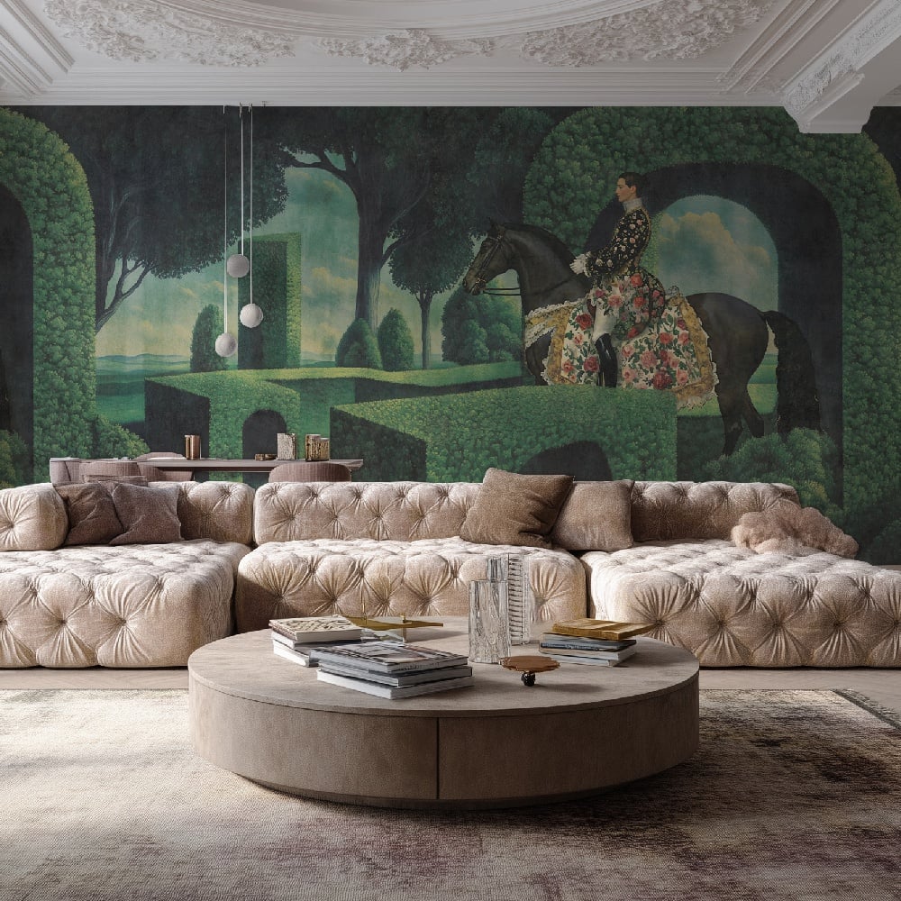 Tapetul Knight’s Maze din colecția Britannia aduce la viață un univers oniric, în care grandoarea aristocratică, teatrul vizual și simbolismul labirintului vegetal se contopesc într-o scenă cu valențe aproape mitologice. Acest model impresionant evocă un moment suspendat în timp, în care un cavaler în straie baroce, splendid ornamentate, călărește printr-o grădină labirintică, tăcută și profund stilizată.