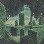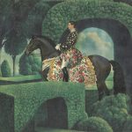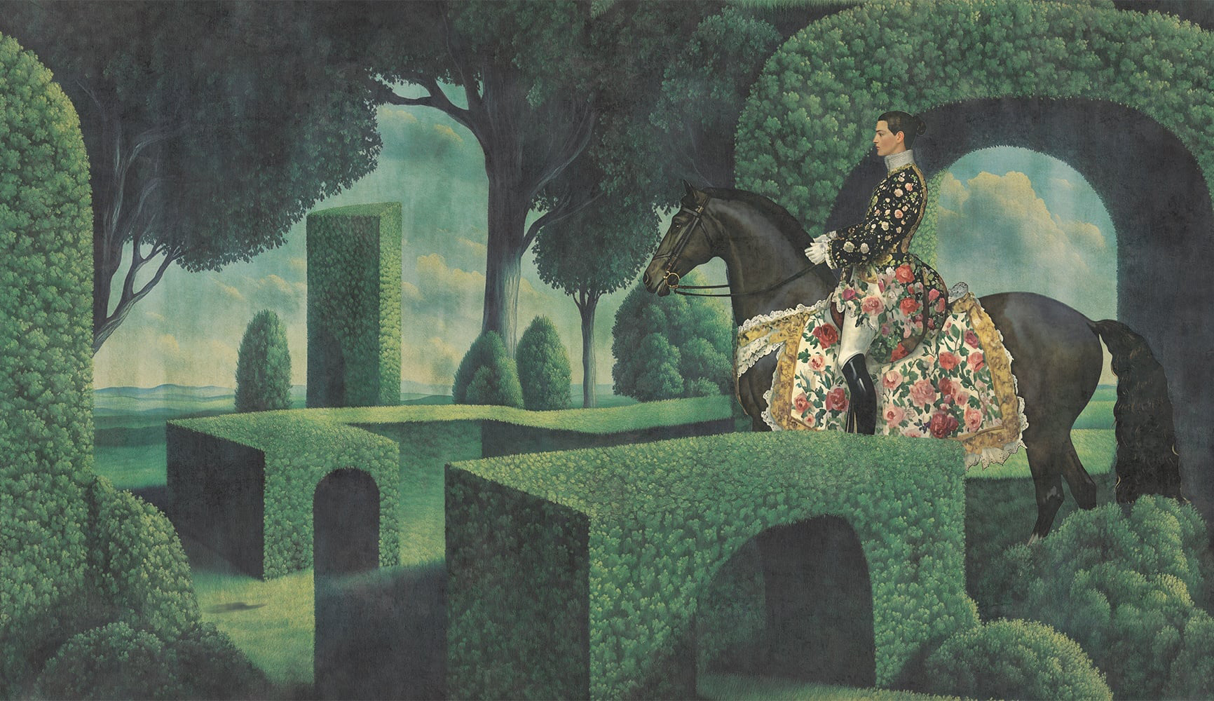 Peisajul este dominat de o arhitectură vegetală monumentală, construită din gard viu perfect tuns, cu arcade și coridoare care par a duce către spații ascunse, nesfârșite. În mijlocul acestei structuri verzi, cavalerul — o figură elegantă, îmbrăcată în broderii florale bogate și montat pe un cal negru nobil — devine simbolul unei căutări nedefinite: o călătorie interioară prin labirintul sinuos al identității, onoarei sau visului romantic.
