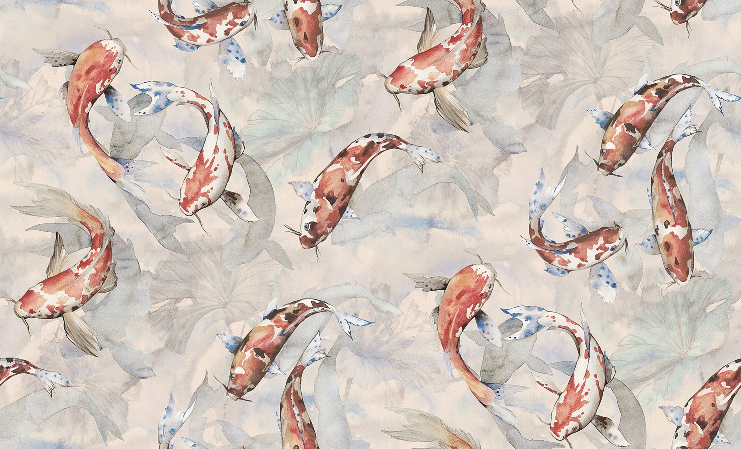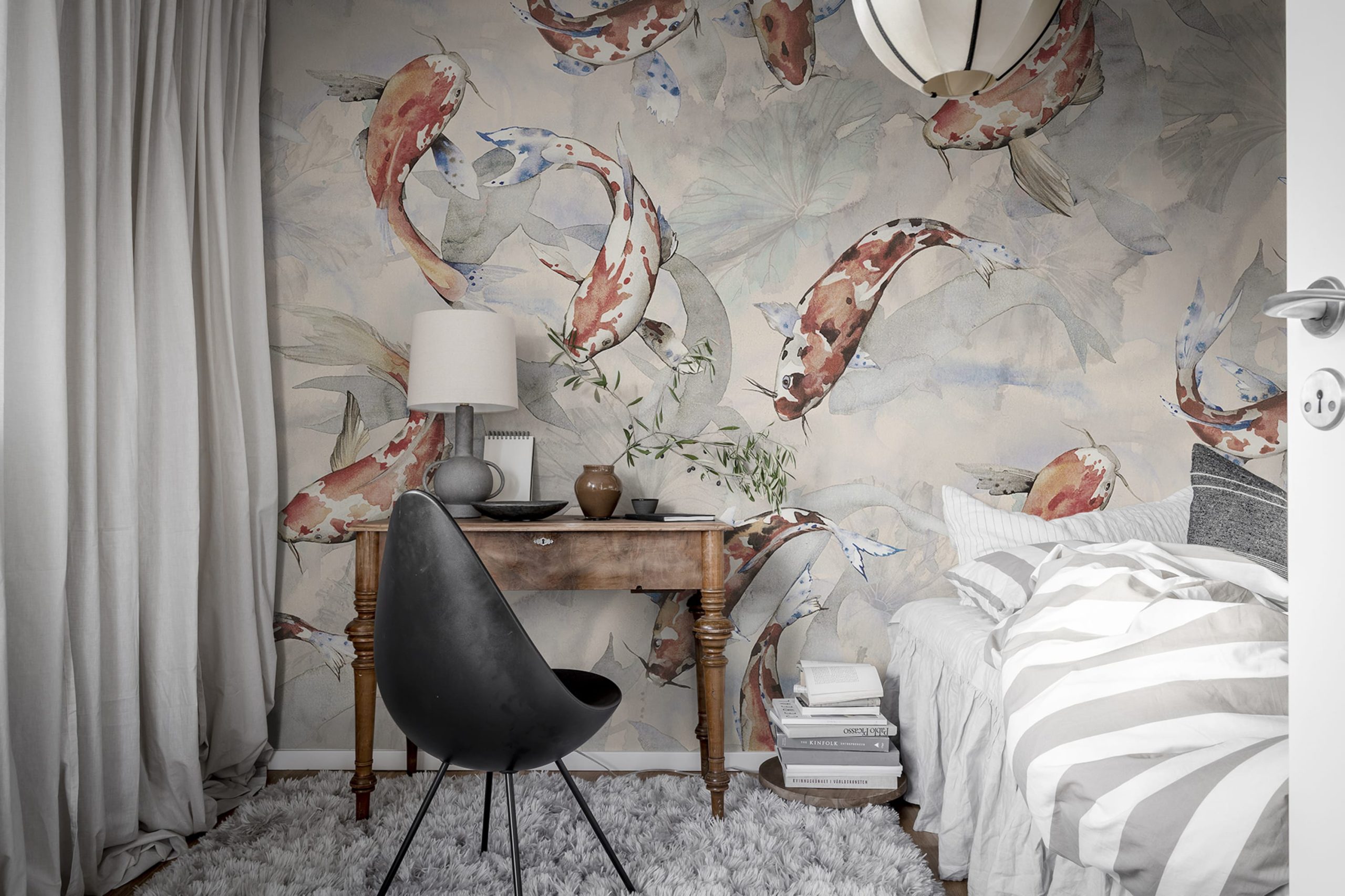 Koi este o acuarelă la scară mare cu pești Koi care înoată pe un fundal de apă cu flori fragile. Acest design oferă camerei un efect de wow la prima vedere, dar după un timp, îți dă o impresie uimitor de echilibrată și rece. Tenta asiatică a acestui design se potrivește foarte bine cu un interior modern ceva mai sobru.