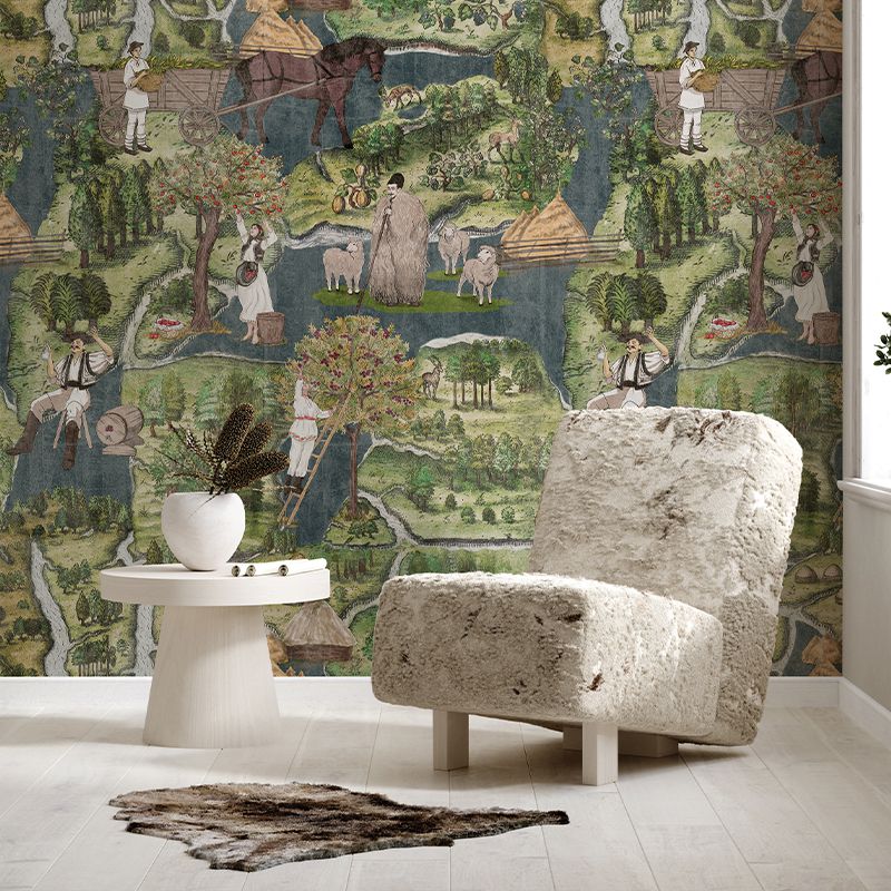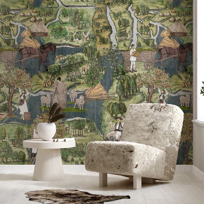 Adaugă un strop de romantism rustic casei tale cu acest La sat. Imaginile vii prezintă scene din viața la țară: cai, oi, oameni care muncesc pământul și un peisaj rural, tot într-un stil vintage, pentru o ambianță caldă și primitoare.