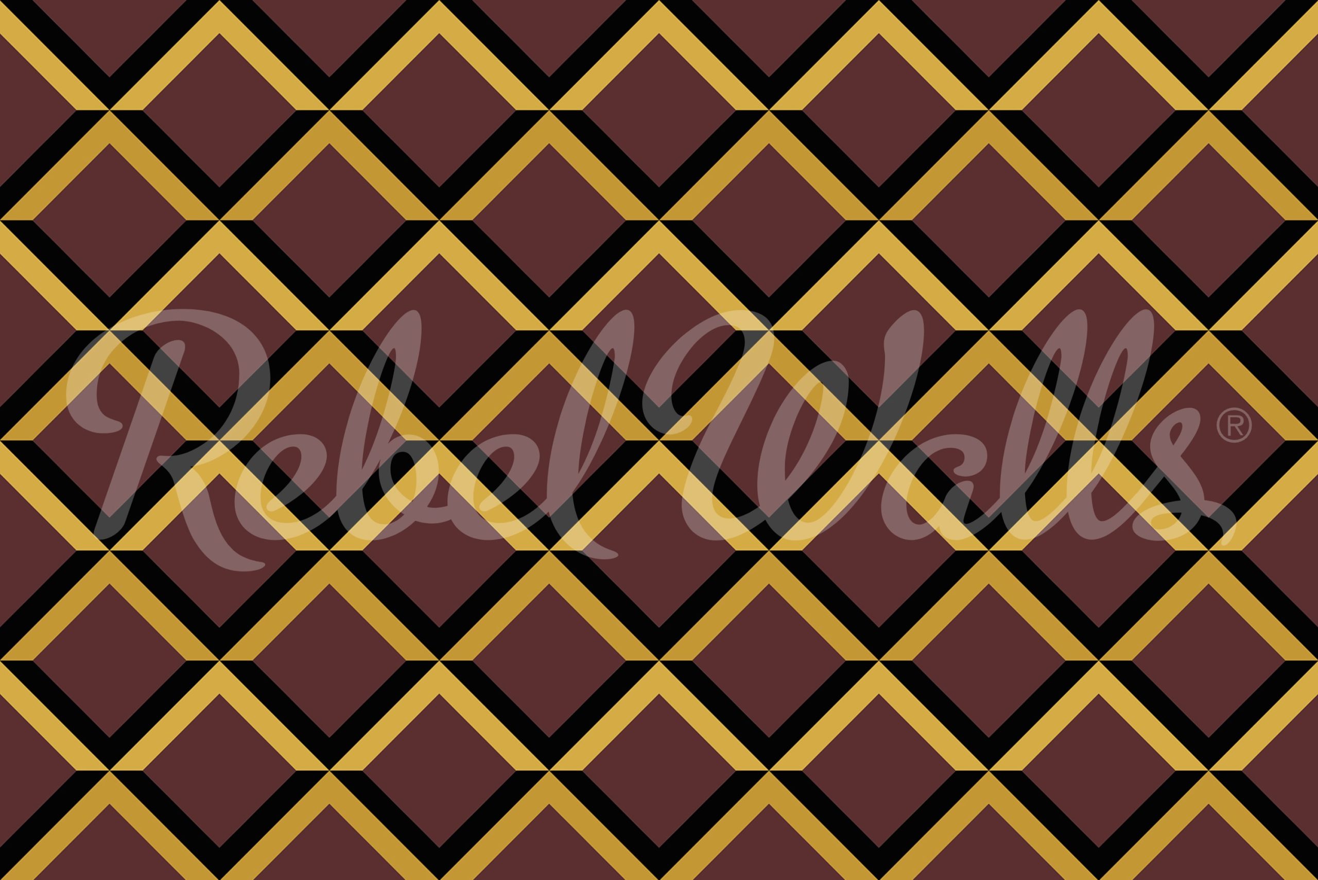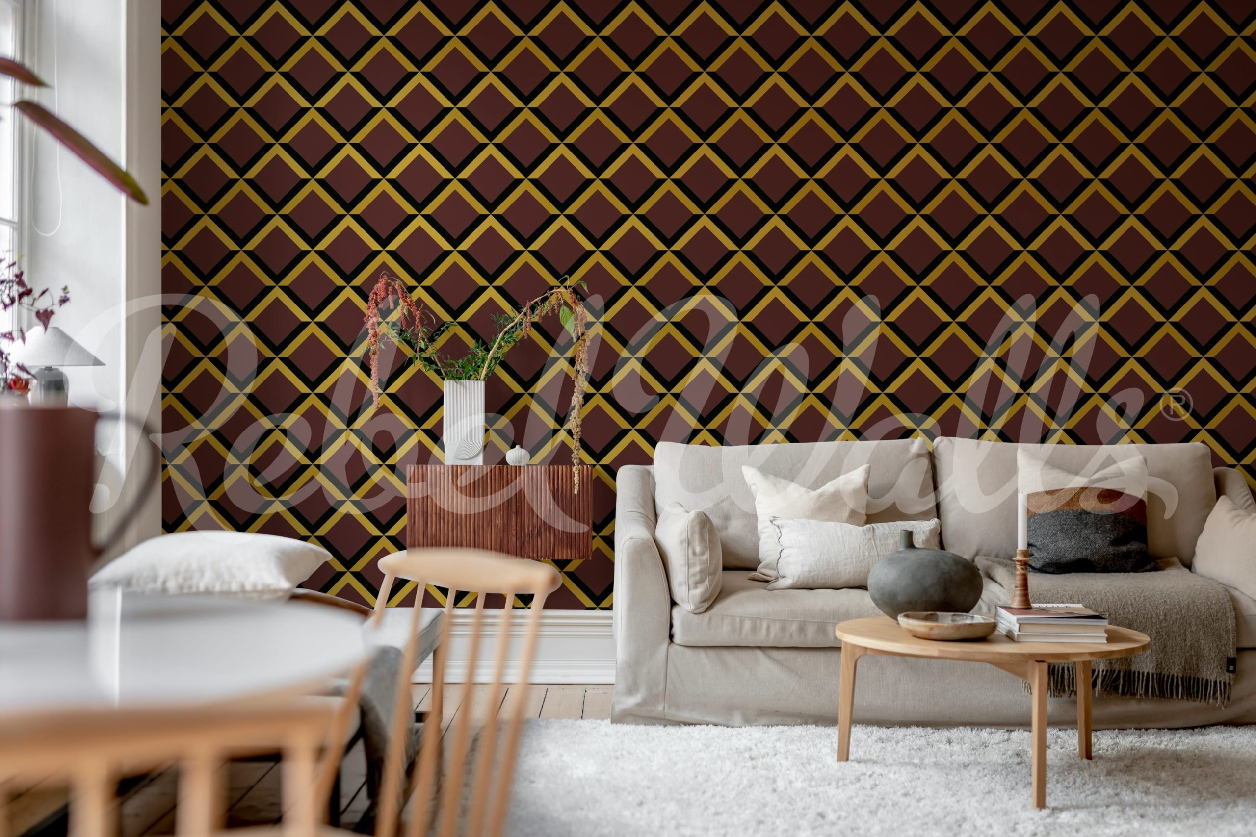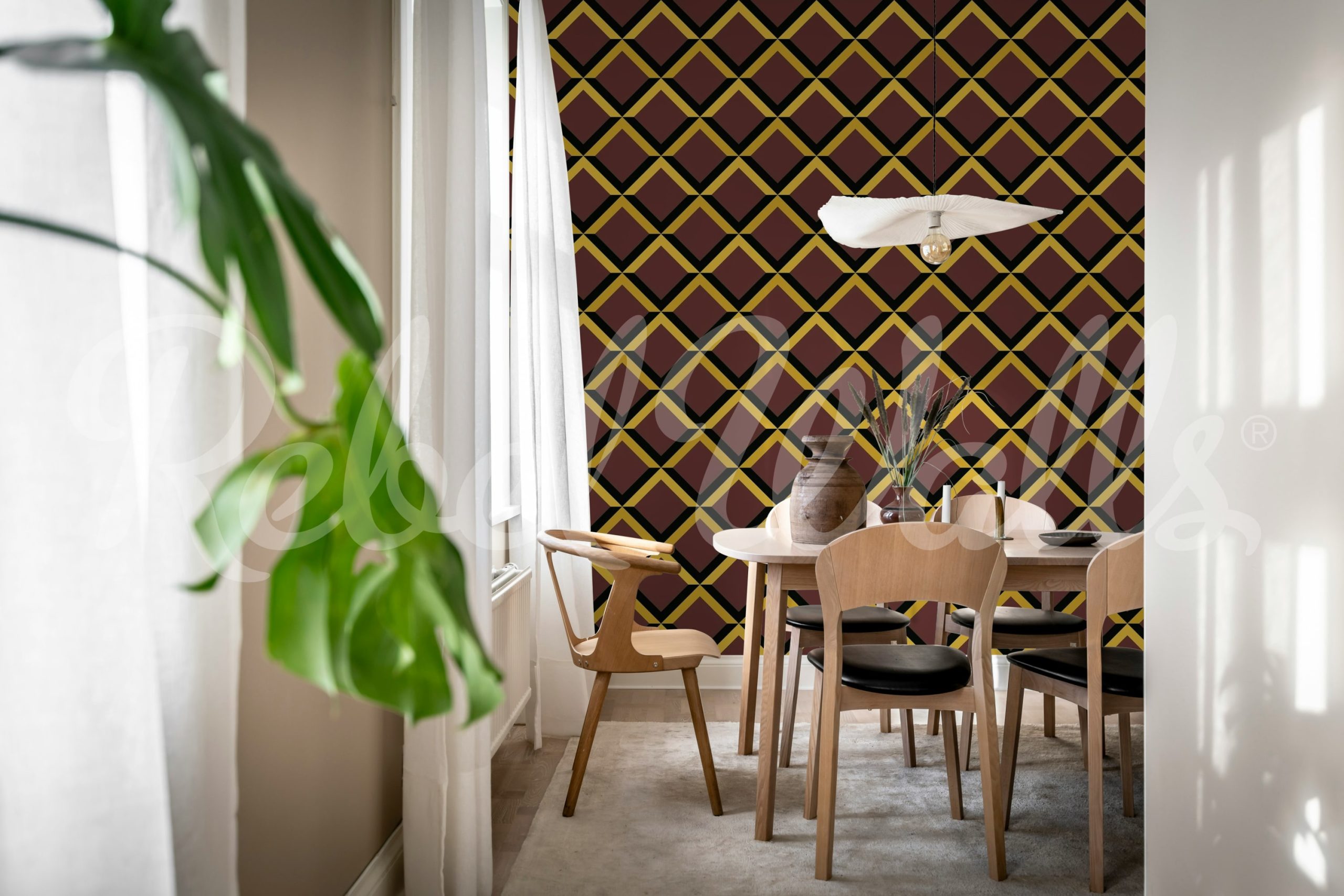 Creează un decor sofisticat cu acest tapet cu model geometric. Nuanțele de burgundy și auriu adaugă căldură și eleganță oricărui spațiu. Ideal pentru un living modern sau un dormitor cu personalitate.
