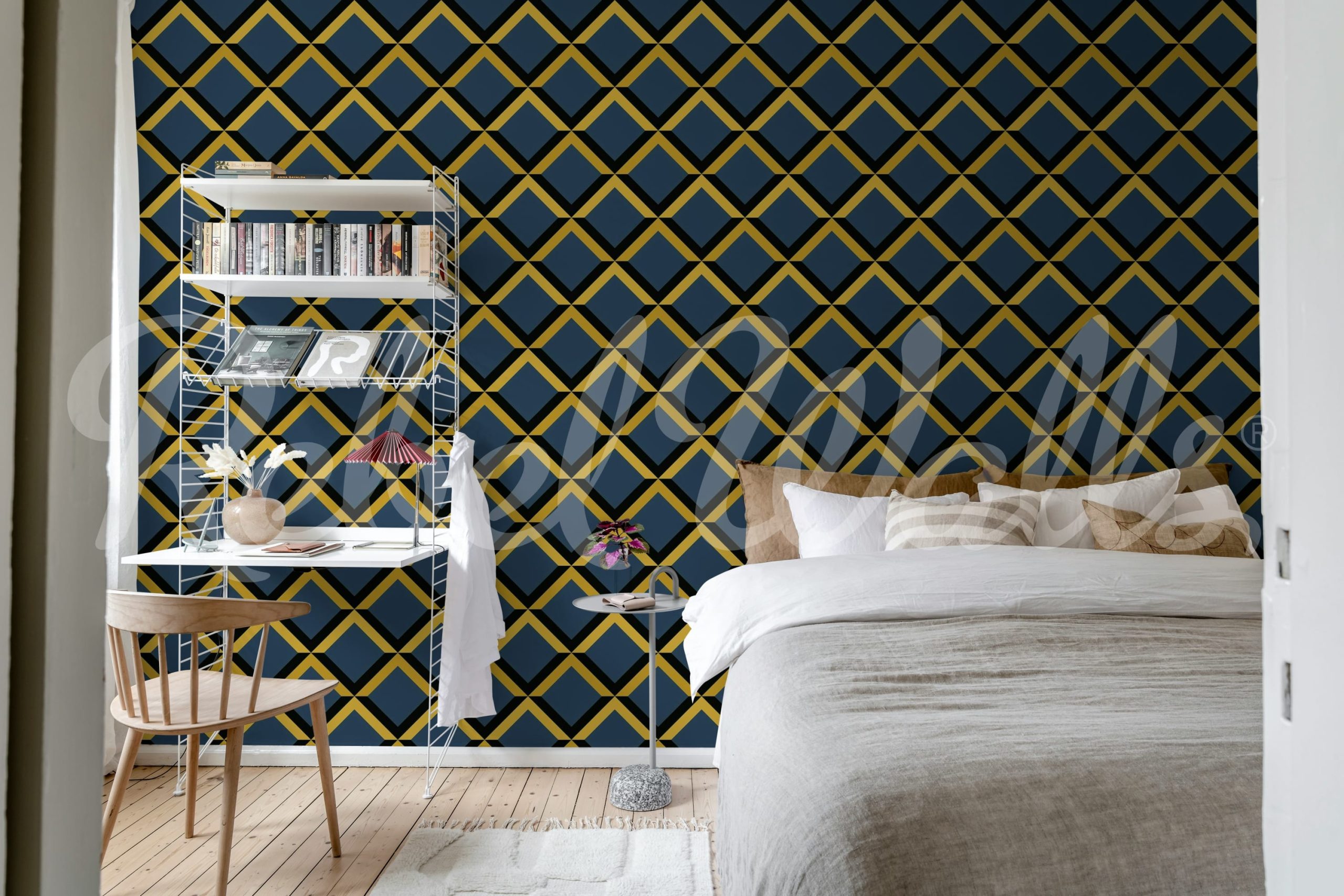 Tapet cu model geometric în nuanțe de albastru închis, auriu și negru. Ideal pentru a adăuga un plus de stil și eleganță oricărui spațiu.