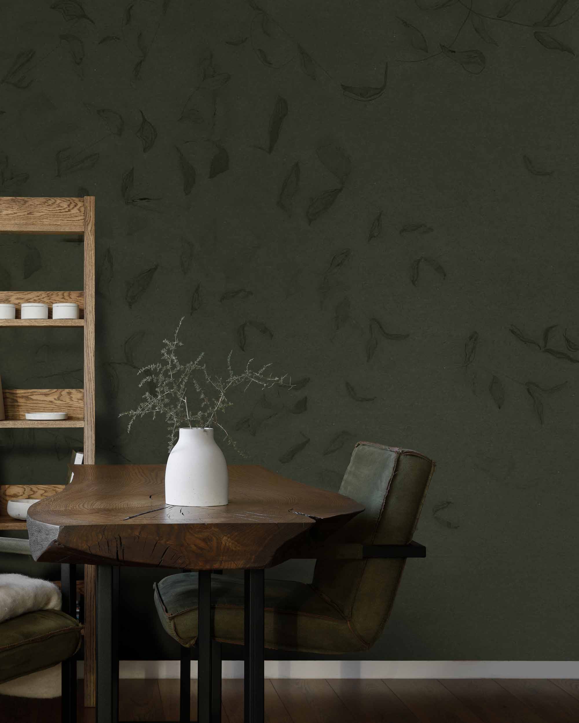 Tapetul Leaves Reflection, Green de la Coordonné este un design vegetal în tonuri de verde din colecția Central Saint Martins – Rest Time. Simplitatea observării efectului luminii în natură și formele magice care apar la diferite momente ale zilei.