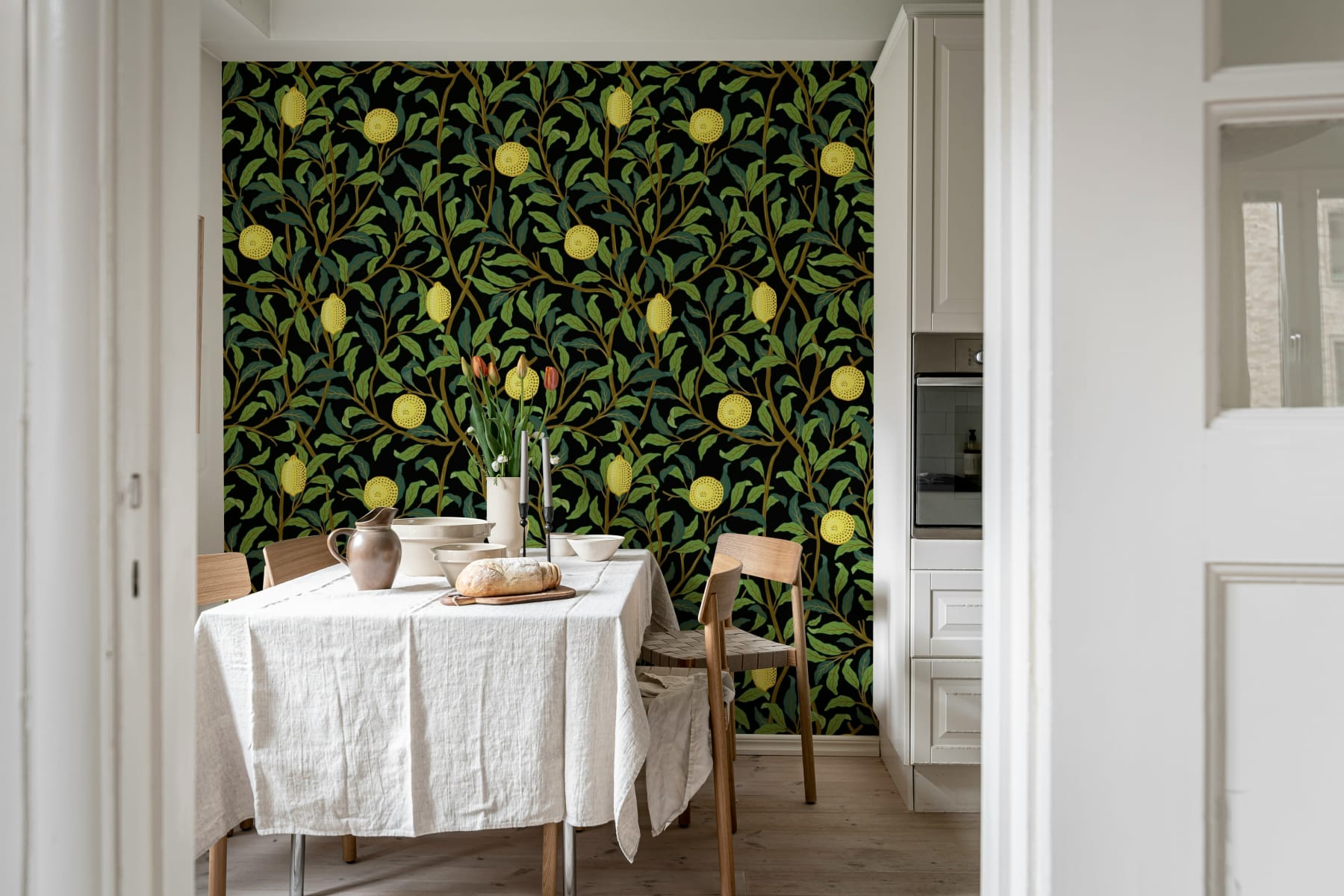 Tapetul Lemon Garden, Midnight prezintă un design viu, inspirat din natură, cu lămâi coapte și frunze de un verde intens, toate așezate pe un fundal negru îndrăzneț, de miezul nopții. Lămâile de un galben vibrant ies în evidență pe fundalul întunecat, adăugând o notă de lux și dramatism oricărei încăperi. Ideal pentru bucătării, săli de mese sau pereți, acest design aduce un aer proaspăt, botanic, cu o notă modernă. Detaliile complexe și contrastul bogat fac Lemon Garden, Midnight perfect pentru cei care doresc să combine frumusețea naturală a unei grădini cu un aspect îndrăzneț, contemporan.
