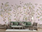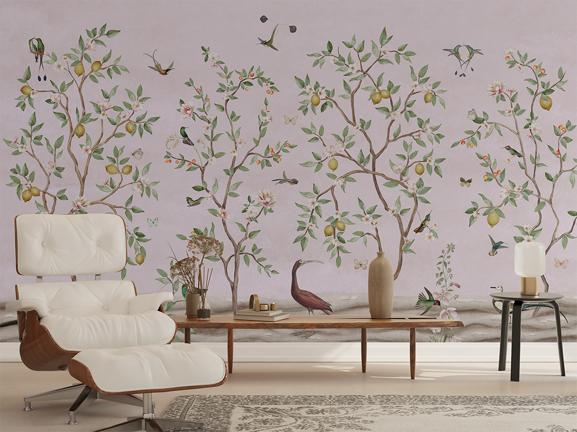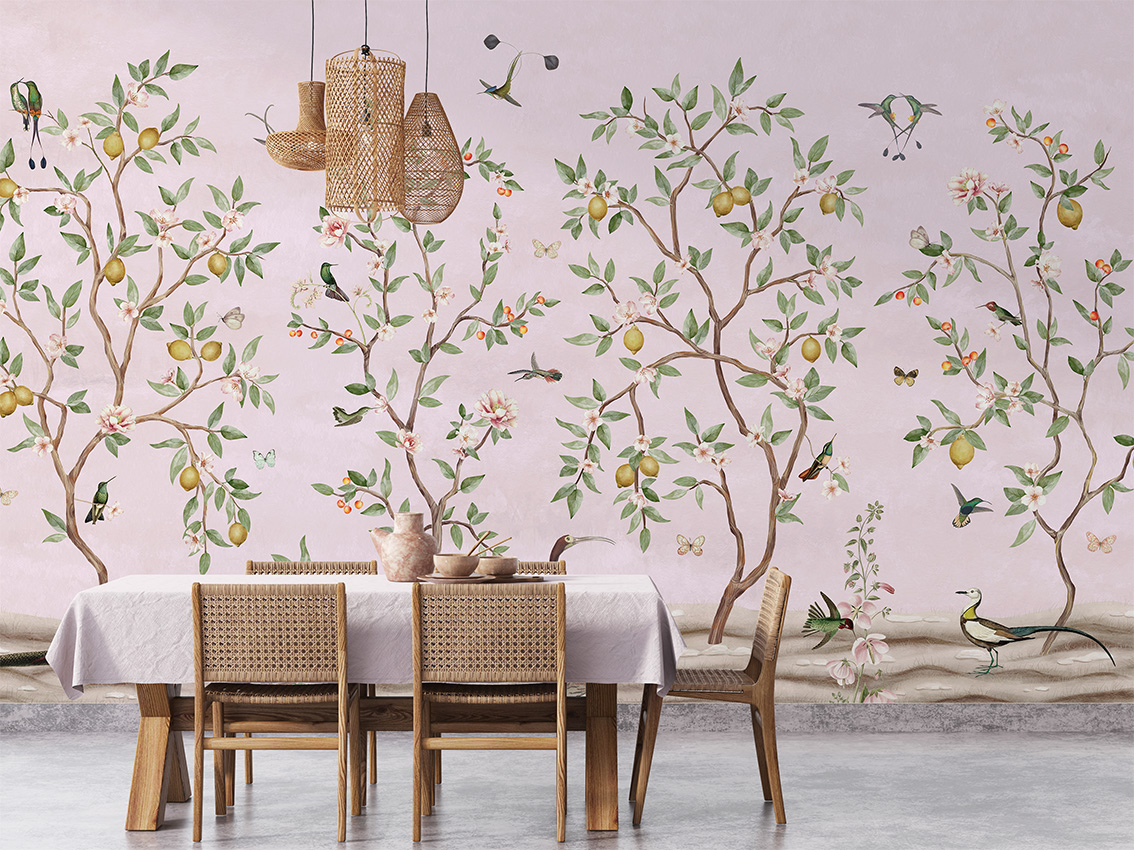 Adaugă o notă elegantă și rafinată cu un tapet cu design Chinoiserie! Un decor floral subtil, cu ramuri de lămâi și accente roz, ideal pentru un interior cald și primitor.