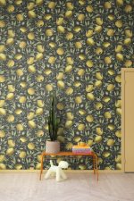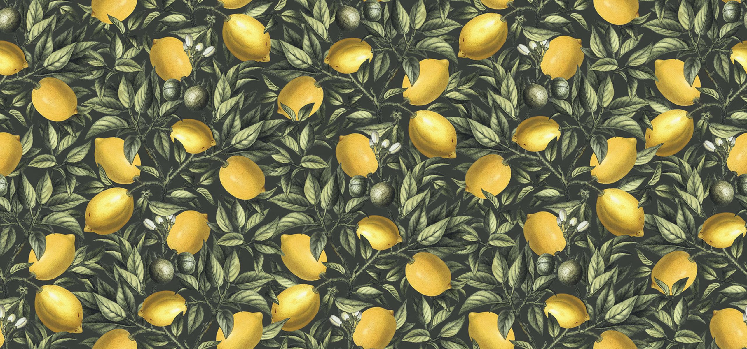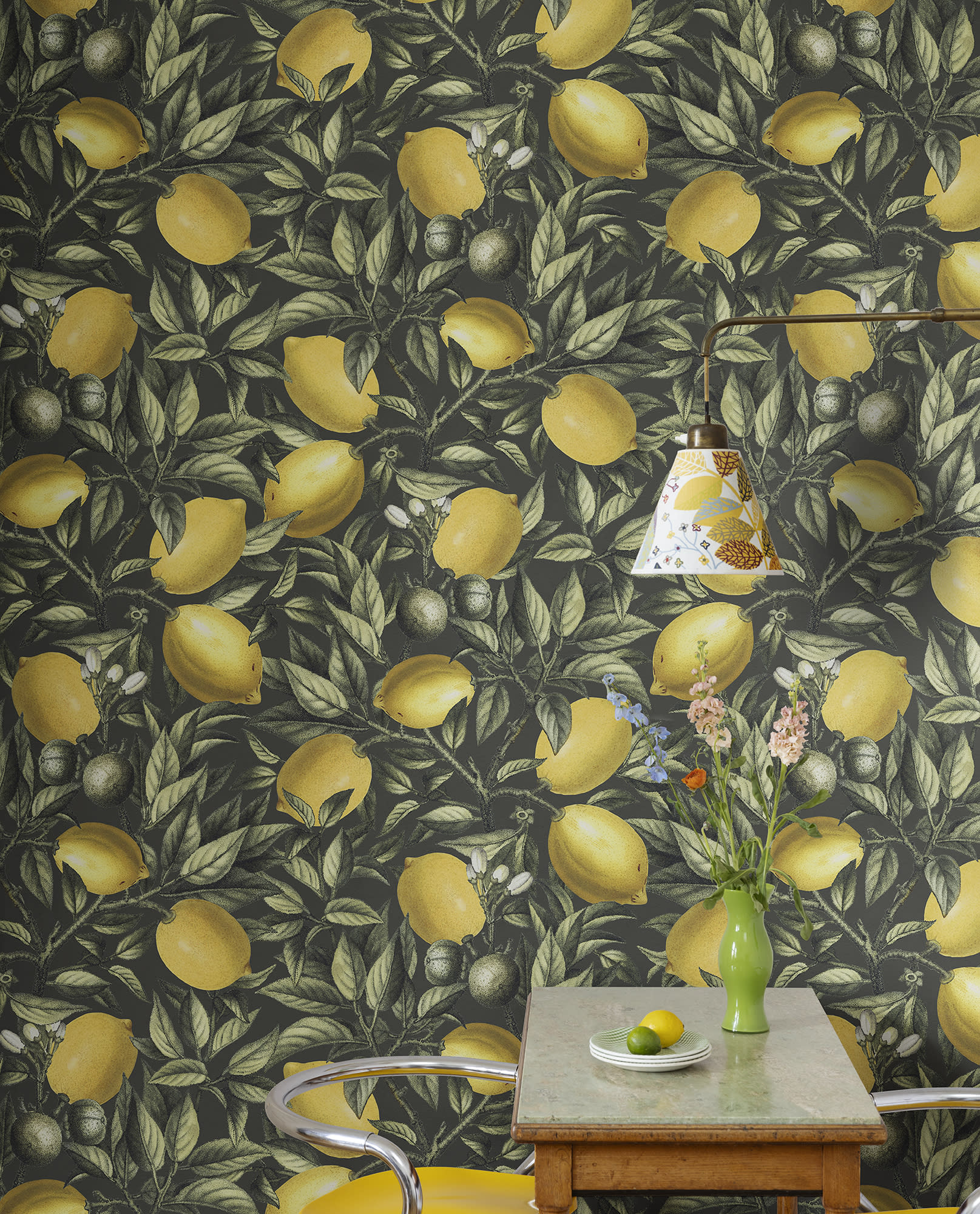 Un perete delicios acoperit cu lamai! Un tapet cool care aduce o senzație plăcută de epocă. Alege varianta de culoare Dark Green pentru un plus de efect! Lămâi galbene strălucitoare, combinate cu nuanțe minunate de verde.