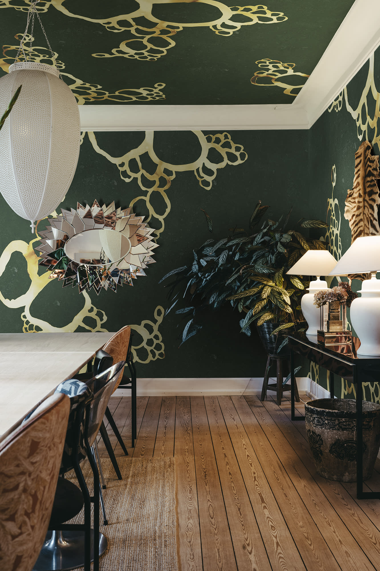 Tapetul uimitor Lightning Clownfish este inspirat din minunile mării și, în mod specific, de modelele uimitoare ale peștelui- clovn fulger. O frumusețe la scară mare atât pe pereți, cât și pe tavanuri! Culoarea Green are un fundal verde închis foarte elegant și un model auriu.