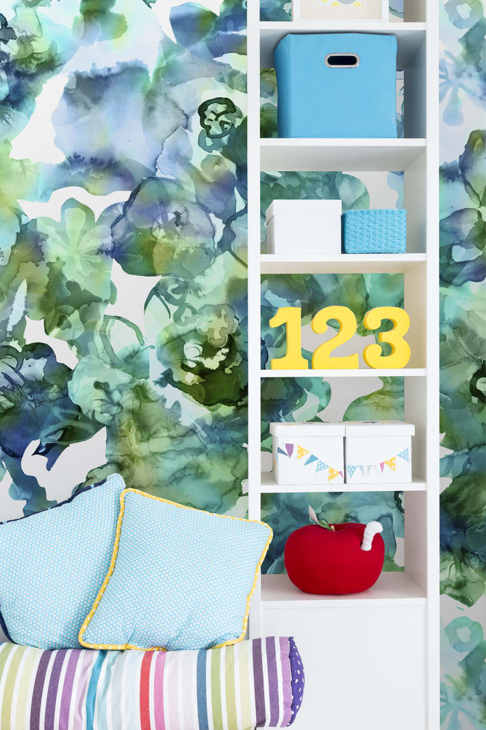 O explozie de culoare, în acest fototapet pictat parcă în acuarelă, în care nuanțele de turquoise, verde, mov și albastru fuzionează într-un model artistic, de mare impact vizual.