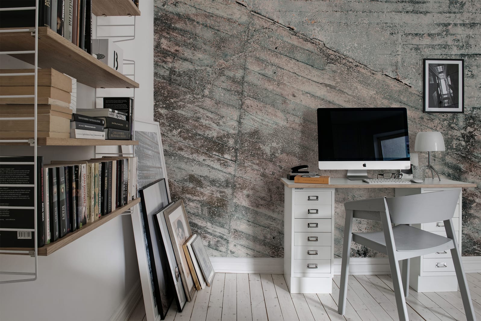 Stând pe o alee dintr-o metropolă, imaginându-și trecătorii, acest fototapet pune pe jar orice cunoscător al vieții orașului. Plin de potențial, imaginea pulverulentă, crudă, sugerează că luați o pauză contemplativă. O perie de vopsea albă pare să ridice imaginea și s-o conducă într-o postură armonioasă. Un stil modern și o achiziție obligatorie pentru cei care crează tendițe. Tonuri de gri se strecoară printre grinzile angulare, dispărând descendent. Acest perete zăbovitor aduce aminte de un loc pentru a reflecta în această lume ocupată, haotică. Aduce un sentiment de despovărare.