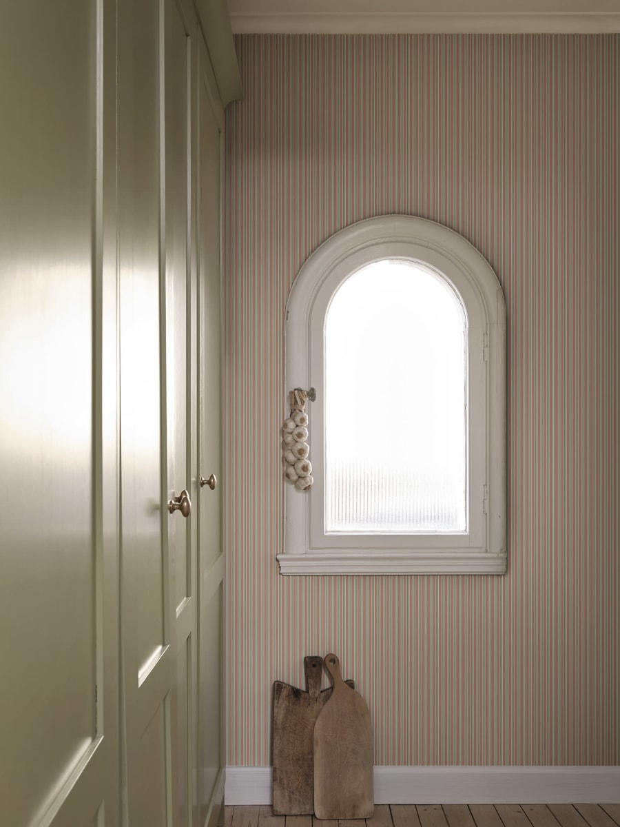 O dungă cool cu un caracter textil moale în culori exclusive care îmbracă pereții atât în mod luxos, cât și stilat. Linn, Pink, vine în nuanțe de roz și verde pe un fundal luminos.