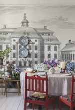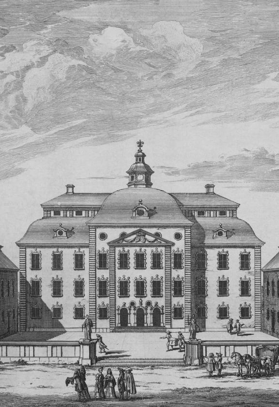 Originalul acestei picturi murale este o gravură mai veche a Castelului Löfstad, creată în secolul al XVII-lea. Gravura se găsește în lucrarea Suecia Antiqua et Hodierna de Erik Dahlberg. Prima versiune a castelului, ridicat de Axel Lillie cel Bătrân, conținea o scară exterioară, turnuri cu frontoane în trepte și fațade pictate cu figuri.