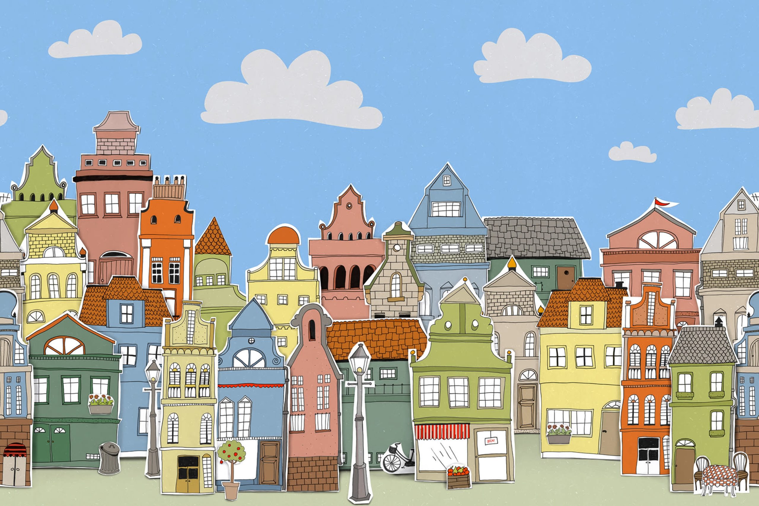 În partea de nord vest a Londrei, veți găsi Notting Hill cu adorabilele sale case. Aici puteți observa abordarea noastră a arhitecurii atemporale – creată în desene 2D, aranjată și fotografiată în 3D.