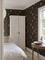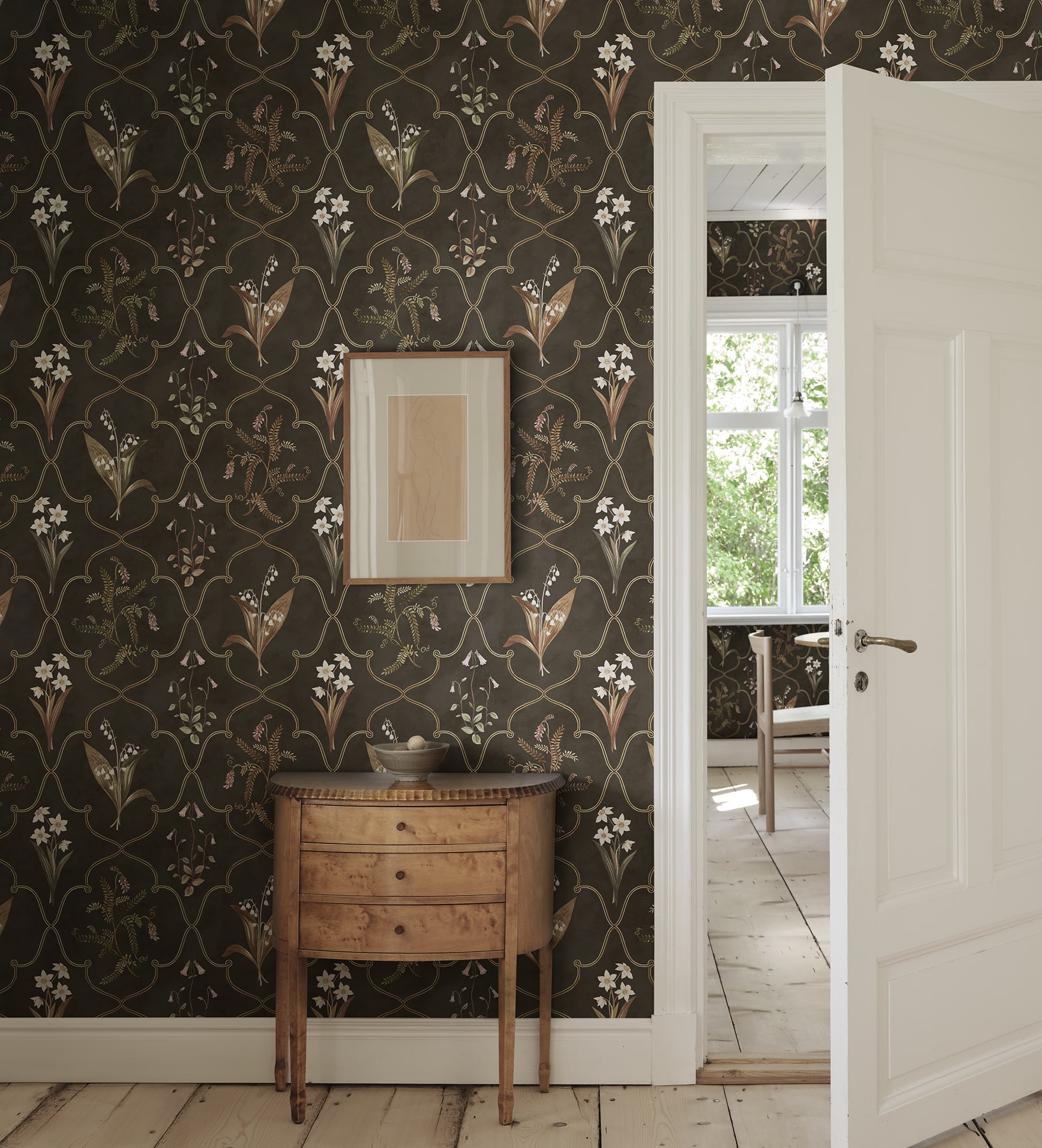 Un design delicat în formă de spalier, cu florile noastre preferate – crinul din vale și floarea gemenilor, frumos încadrate într-un grilaj fin, alături de Narcisa Poetului și Veci. Louise, Dark contrastează un fundal negru-maroniu intens și bogat cu frunze verde-pământean și flori albe.