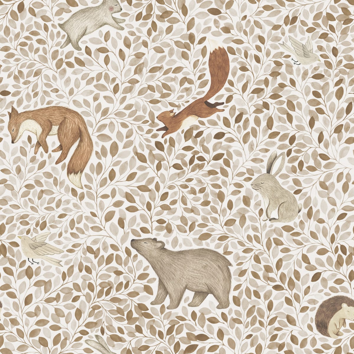 Animale de pădure drăgălașe dorm strâns în frunziș frumos. Acest model super drăguț, pictat în aquarelle, aduce seninătate și farmec pereților dvs. Lullaby, Beige, este disponibil în bej și maro moale.