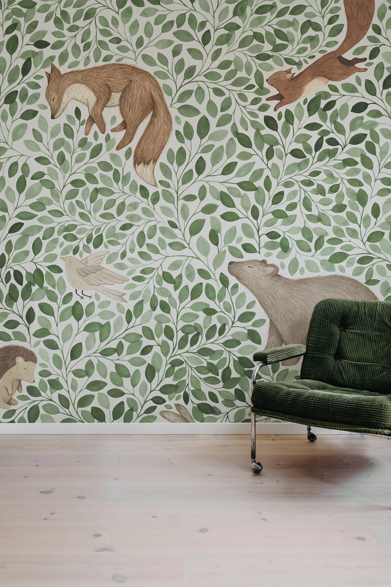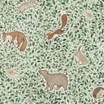 Animale de pădure drăgălașe dorm strâns în frunziș frumos. Acest model super drăguț, pictat în aquarelle, aduce seninătate și farmec pereților dumneavoastră. Lullaby, Green, vine în nuanțe de verde viu și maro moale.