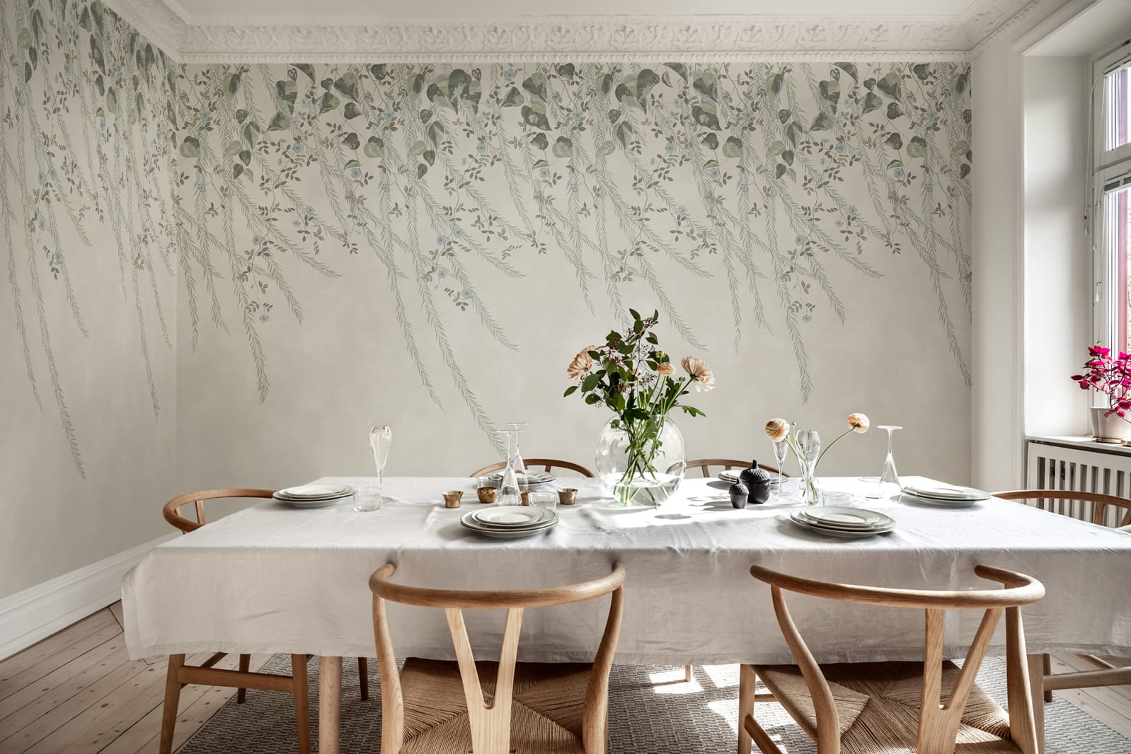 Fototapet „chinoiserie” cu frunze luxuriante de salcie plângătoare și flori șerpuite. O piesă de artă de vis și de lux pentru peretele tău, inspirată de pictura de artistei Diane Hill.