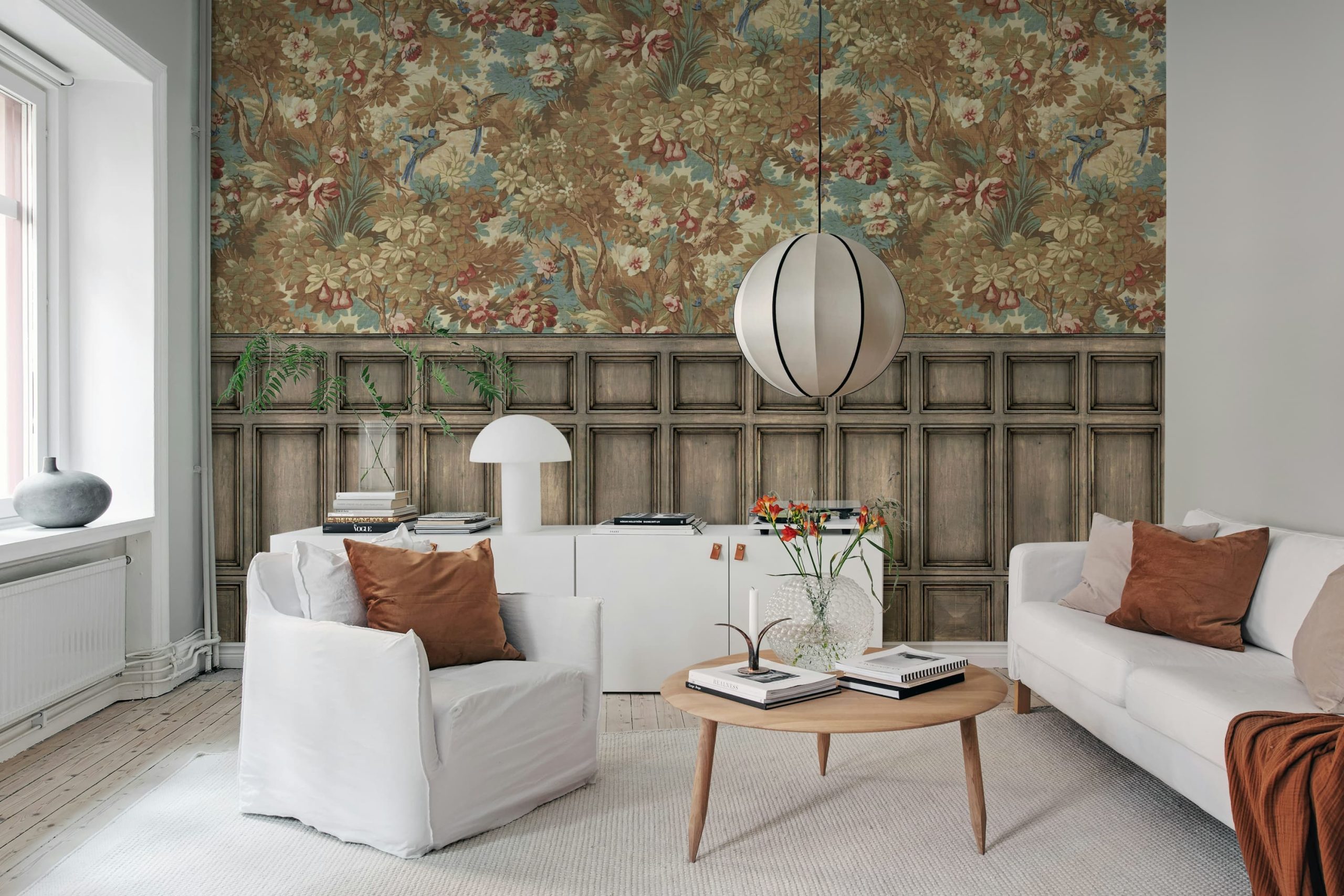 Adaugă un farmec unic casei tale cu acest fototapet! Designul său cu elemente florale și panouri decorative creează o atmosferă elegantă și primitoare. Ideal pentru living sau dormitor.