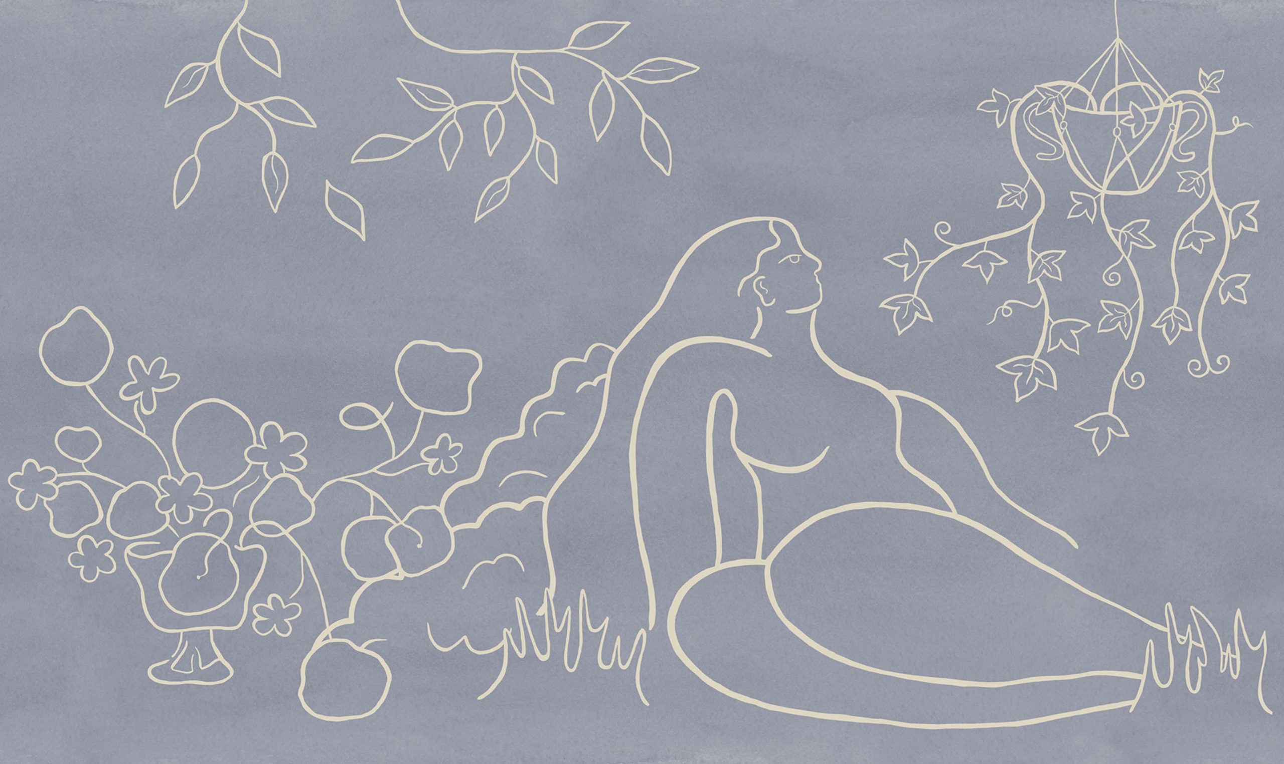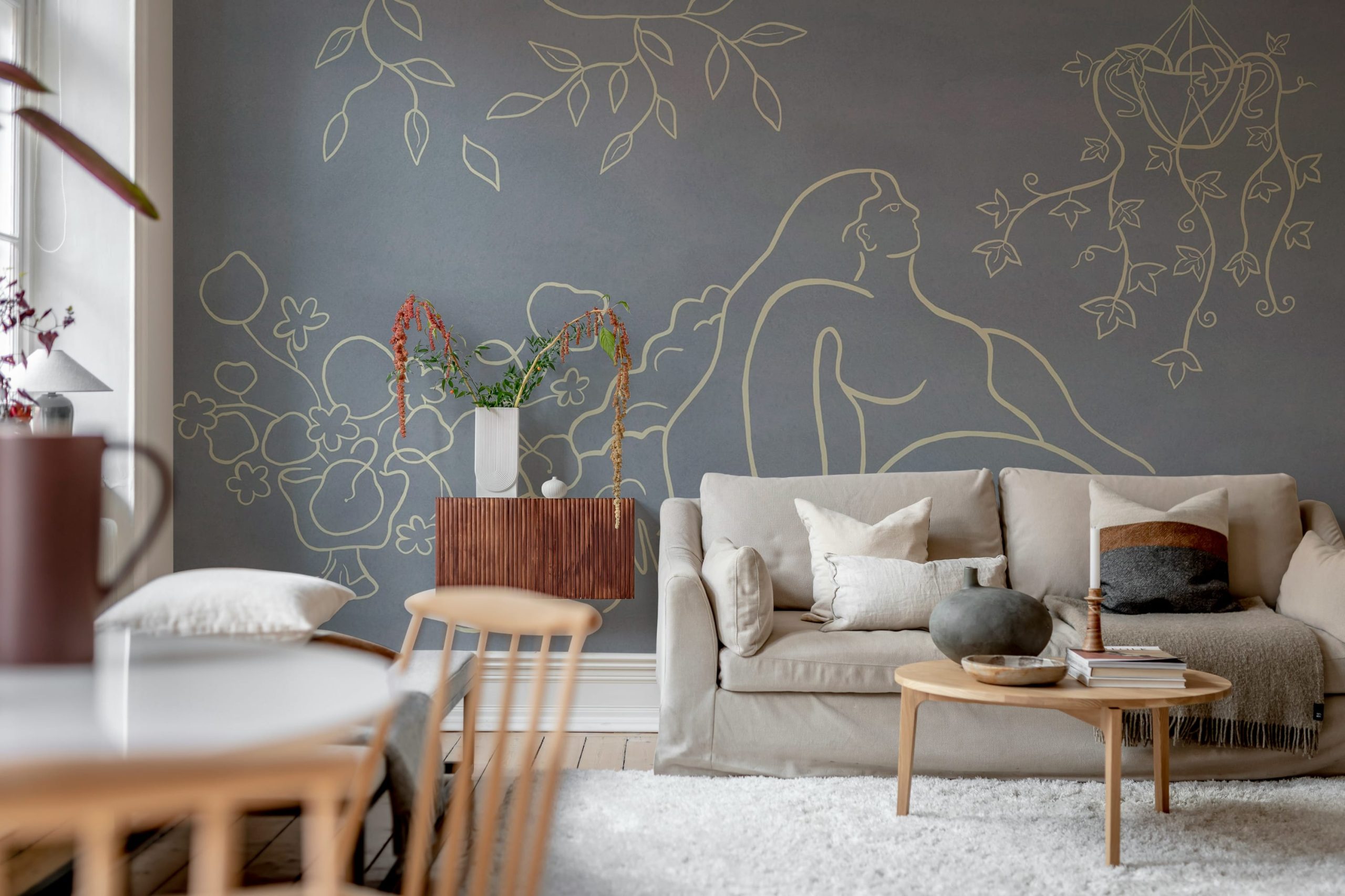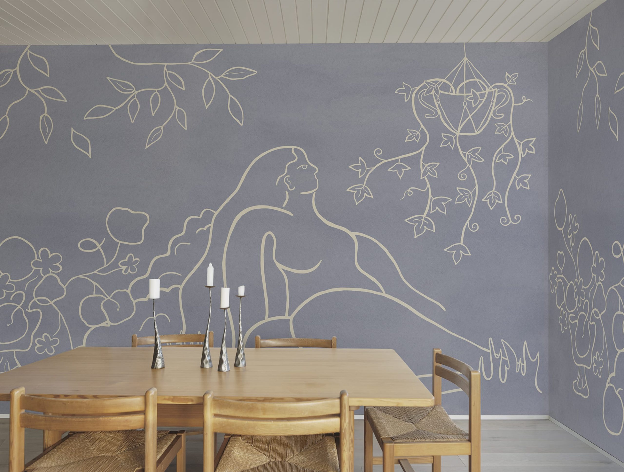 Îmbrățișați liniștea cu un desen delicat al unei figuri întinse, împletit cu liane luxuriante și flori capricioase. Plasat pe un fundal albastru liniștitor, acest desen combină eleganța naturală cu flerul artistic, perfect pentru o retragere senină.