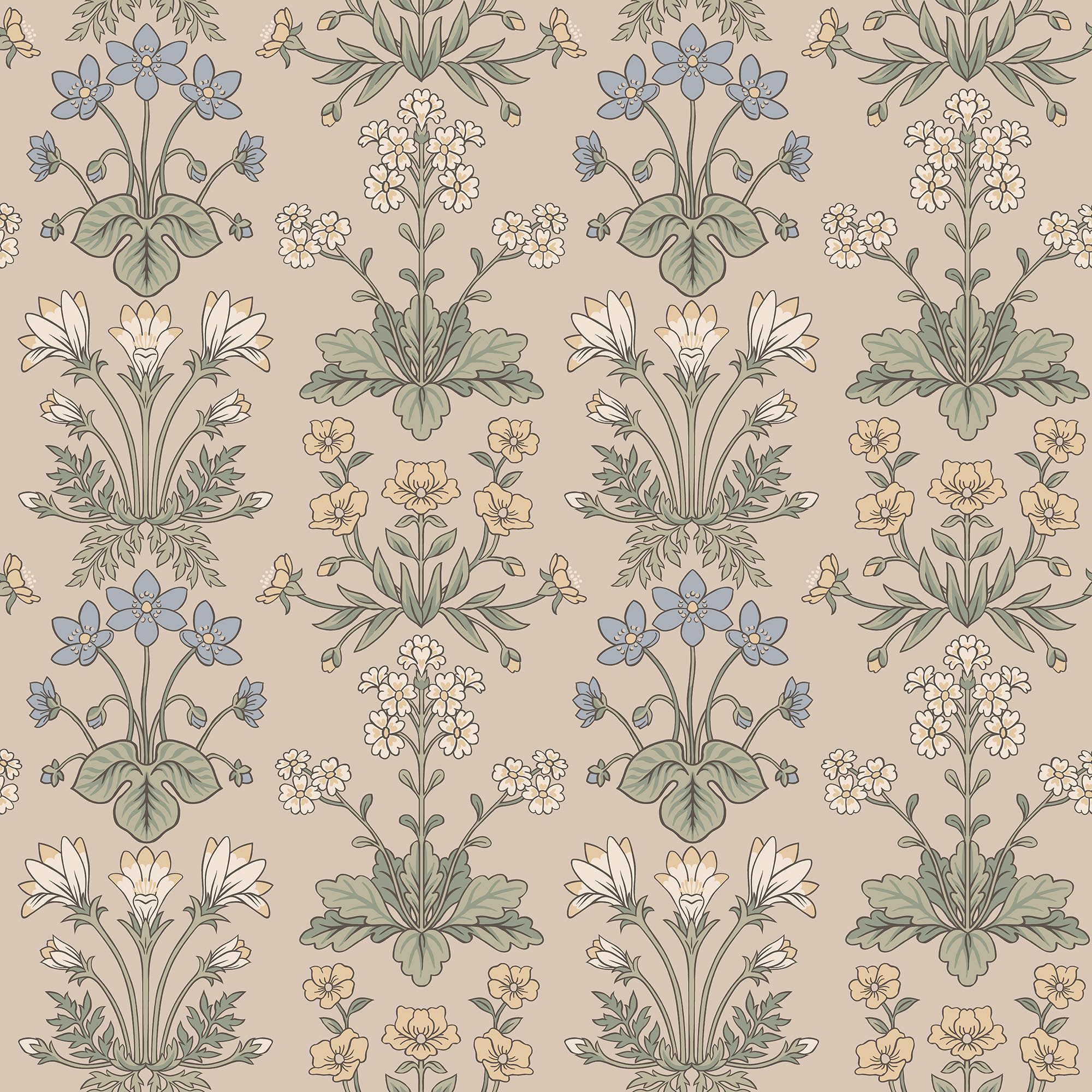Minunatele plante bulboase care cresc sălbatice în habitatul lui Öland sunt primele semne ale primăverii și ale sosirii căldurii. Acest tapet medalion rar include Bluebell, Wood Anemone, Cowslip și Sun Rose. Schema de culori, Clay, vine cu o bază de culoarea lutului, frunze verzi și flori drăguțe în albastru, galben și alb.