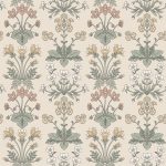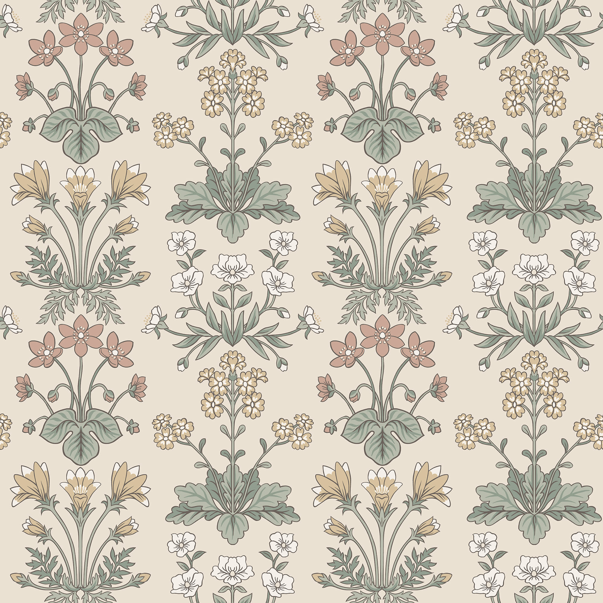 Minunatele plante bulboase care cresc sălbatice în habitatul lui Öland sunt primele semne ale primăverii și ale sosirii căldurii. Acest tapet medalion rar include Bluebell, Wood Anemone, Cowslip și Sun Rose. Combinația de culori, Sandstone, vine cu o bază bej, frunze verzi moi și flori drăguțe în galben cald, alb și teracotă.