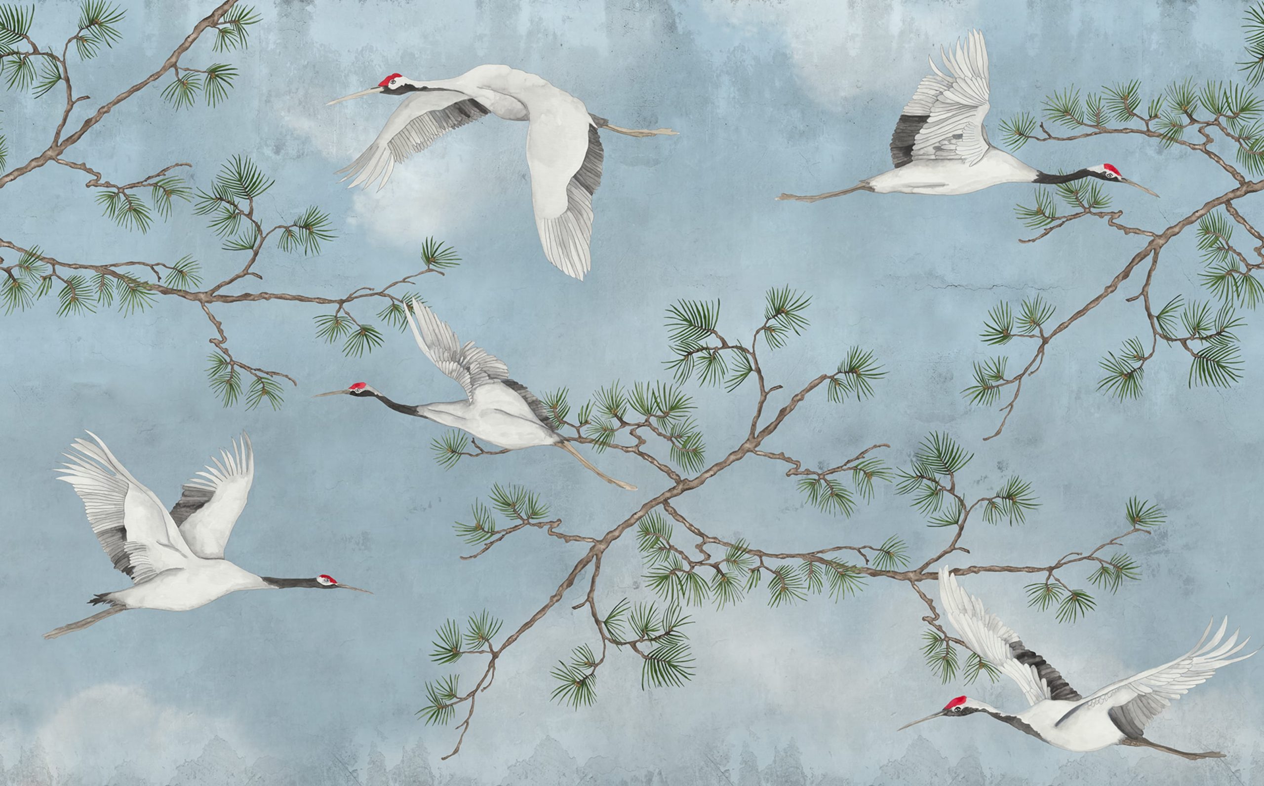 Tapetul nostru pictat manual, Majestic Cranes, prezintă un design senin de cocori eleganți în zbor, plasați grațios pe un cer înnorat și ramuri delicate de pin. Norii moi evocă un sentiment de calm, în timp ce detaliile complicate ale cocorilor și ramurilor de pin aduc frumusețea naturii în interior. Culoarea Blue prezintă un cer albastru blând, ramuri verzi și maro și cocori în alb, negru și roșu.