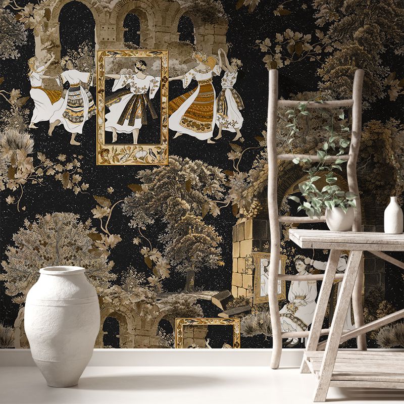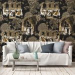 Mândre, Vladila, este un design tapet elegant, cu motive tradiționale românești, ce reprezintă o combinație perfectă de eleganță și autenticitate. Imaginile cu femei în costume populare, încadrate de arcuri de piatră, oferă un aer romantic și nostalgic. Tonurile calde de aur și gri pe fundal negru creează un contrast dramatic, perfect pentru a adăuga un element dramatic spațiului tău.