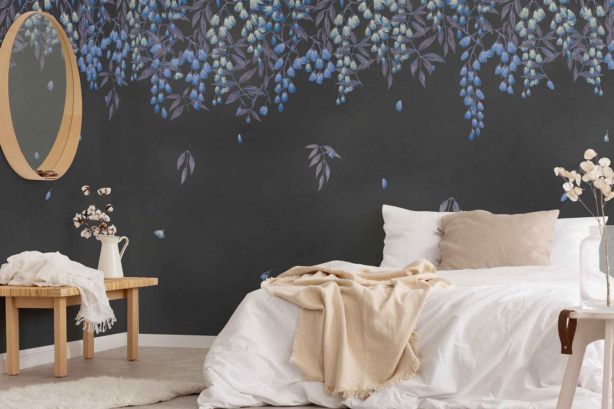 Imbraca-ti peretii cu un fototapet floral elegant, cu flori albastre delicate pe fundal inchis. Ideal pentru dormitoare sau livinguri moderne, aducand un aer sofisticat si relaxant. Creeaza un spatiu unic cu acest tapet deosebit!