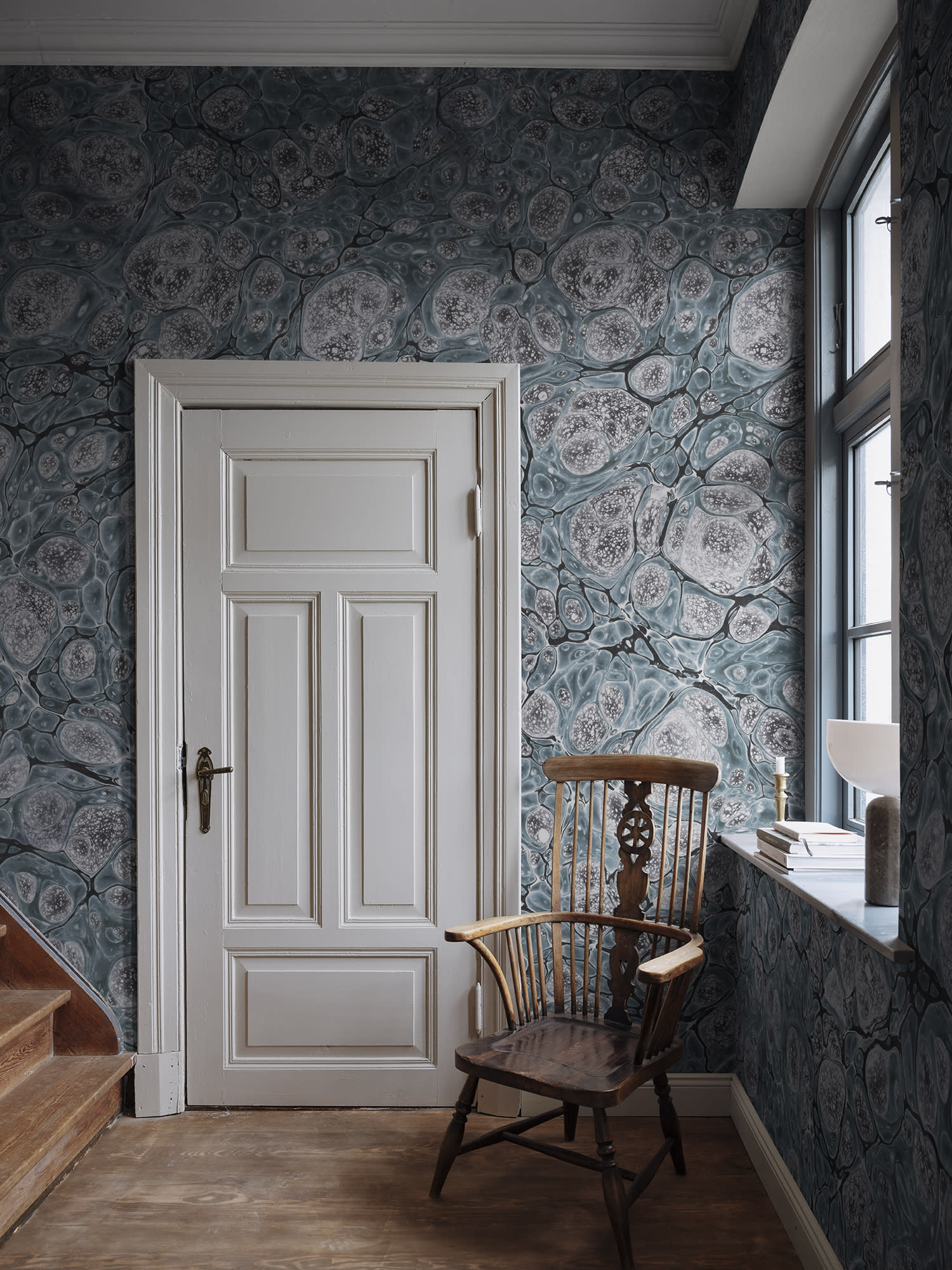 Acest tapet oferă un efect „wow” imediat și satisfăcător! Textura organică și granulată a marmurei oferă o senzație de lux și conferă spațiului tău un aspect elegant, dar și răcoritor. Varianta Blue vine în nuanțe de albastru, alb și negru.