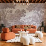 Memory Bridge Wallpaper este o odă lirică a conexiunii — între trecut și prezent, pământ și cer, structură și spirit. Pictat manual în nuanțe de albastru estompat, terracotta cald și tonuri aurii subtile. Muralul înfățișează un arc elegant peste apă. Este un simbol al trecerii și al reflecției.