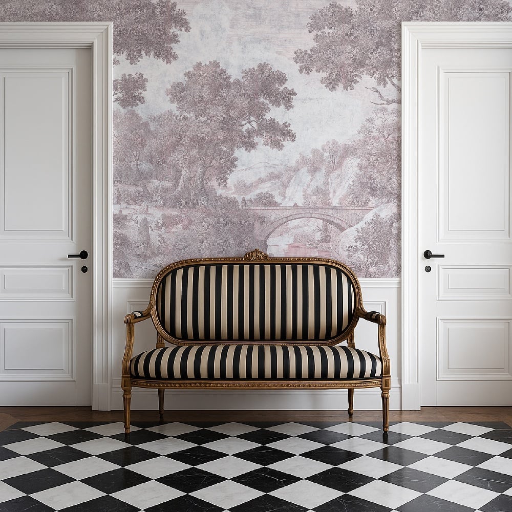 Memory Bridge se poziționează ca mural lucrat manual, acoperire artistică pentru pereți, tapet de lux și design atemporal — un testament al eleganței aristocratice.