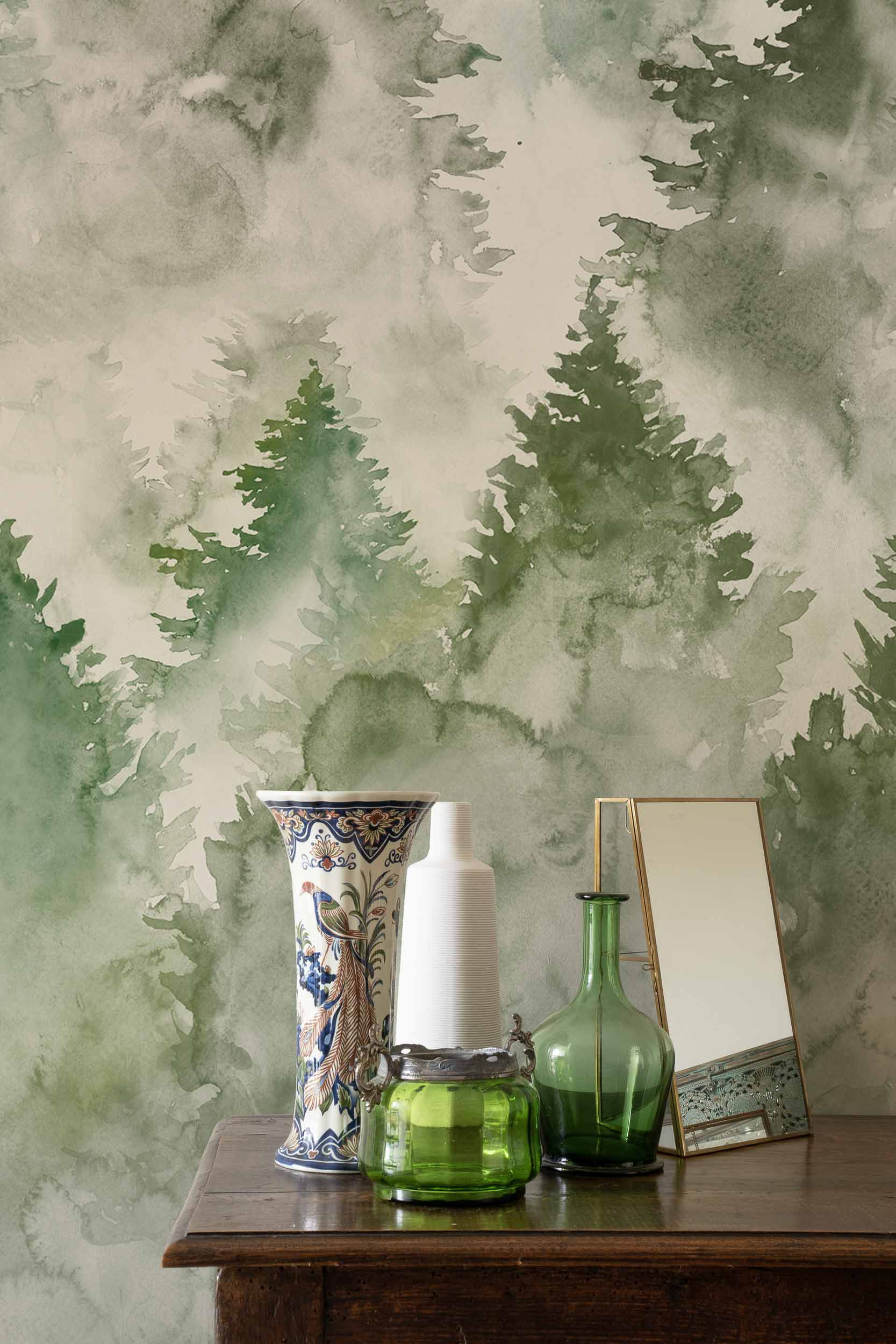 Mendia, Menta, din colecția Lur, este un tapet peisagistic, în nuanțe de verde. Pădure enigmatică de pini învăluită într-o ceață densă de iarnă.