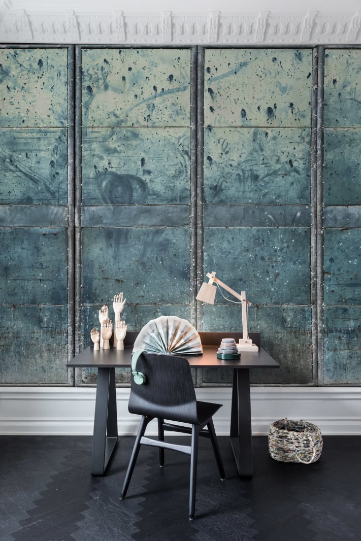 La locul de muncă te vei găsi adesea prins între extreme, ocupat și plictisit, luni și vineri. Acest design se adaptează foarte ușor la schmbări, fiind în același timp cald, datorită albastrului petrol dar și rece, datorită metalulului.