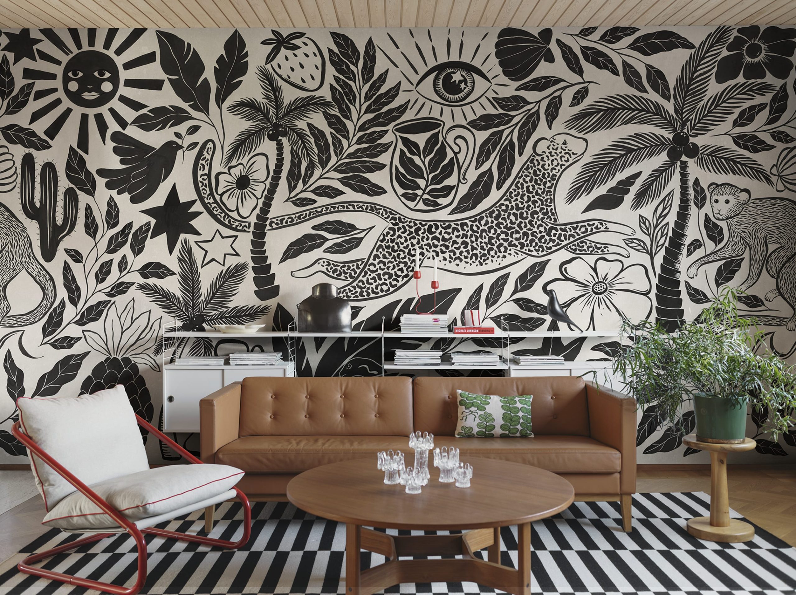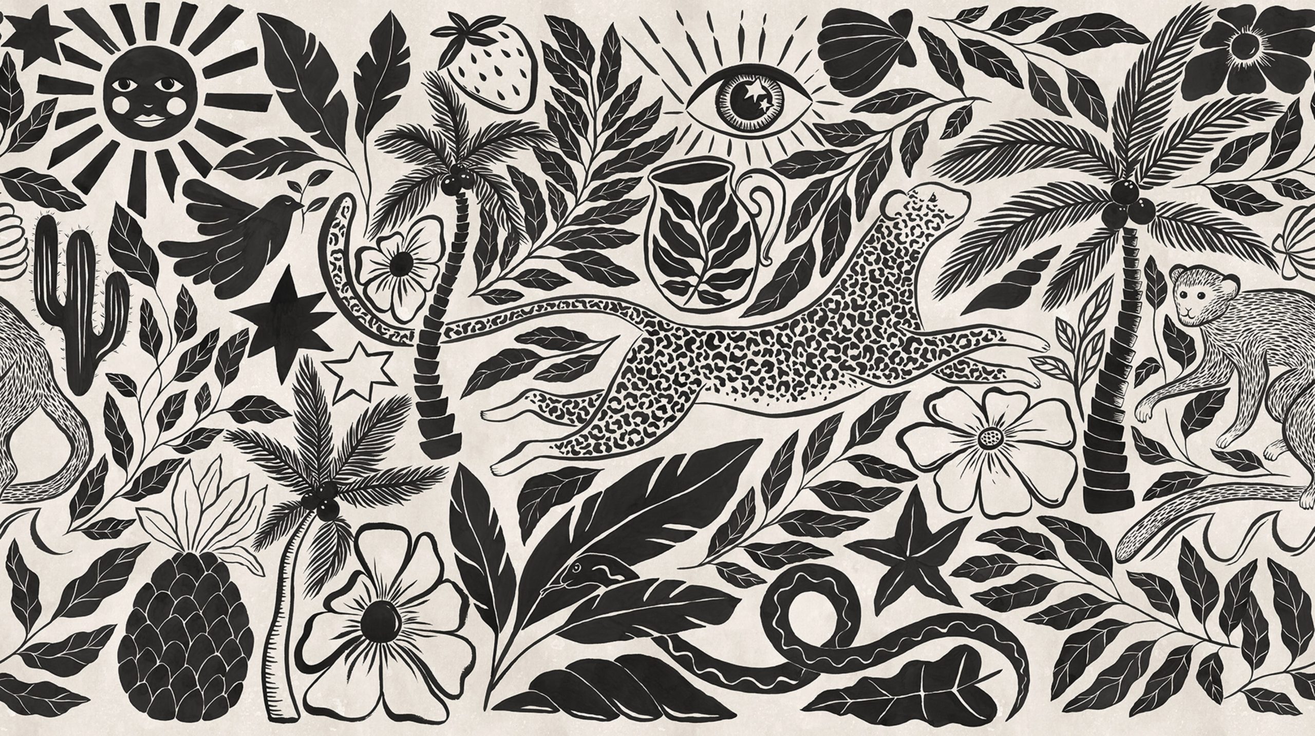 Scufundați-vă într-un paradis tropical cu Midnight Tropics. Această capodoperă alb-negru prezintă palmieri detaliați și animale exotice precum leoparzi și maimuțe. O serie artistică de sori, stele și elemente simbolice oferă o notă jucăușă, dar elegantă, creând o ambianță plină de viață, perfectă pentru interioarele moderne.