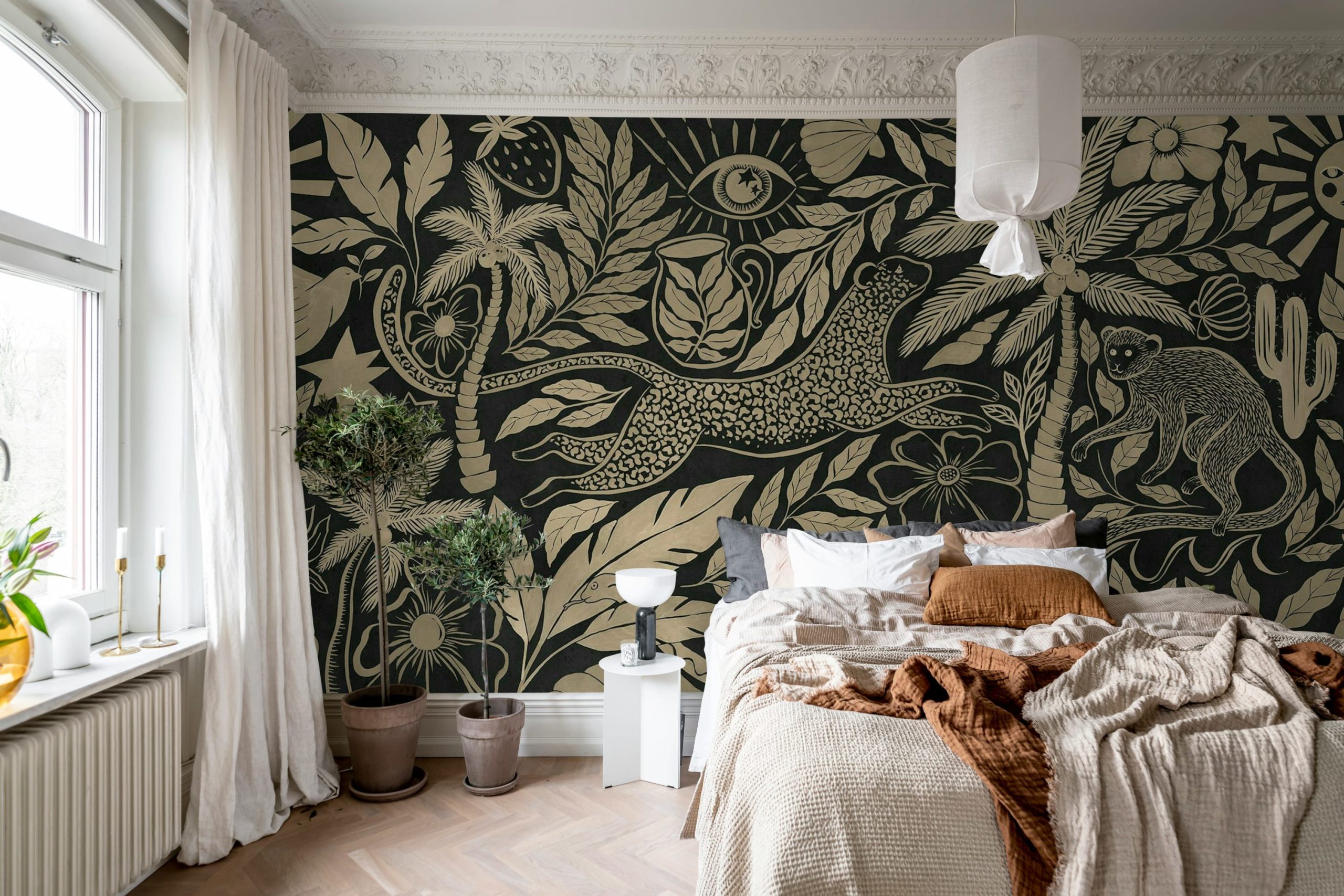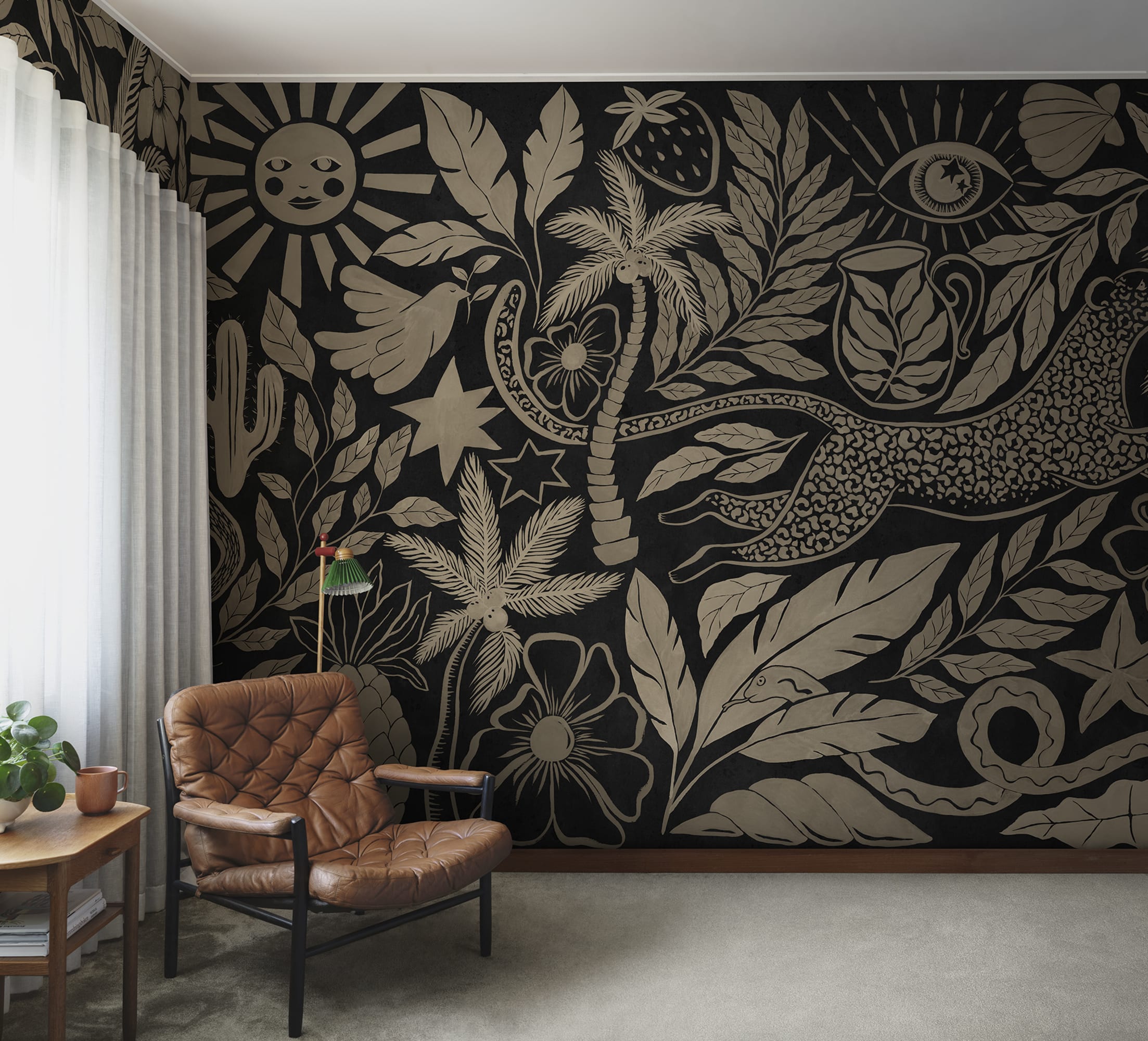 Explorați farmecul Midnight Tropics într-o paletă aurie uimitoare. Acest tapet prezintă o tapiserie luxuriantă de palmieri tropicali, leoparzi sălbatici și frunze exotice așezate pe un fundal negru intens. Amestecul captivant de elemente simbolice precum stele și ochi adaugă o notă de mister pereților dvs. Perfect pentru cei care doresc să facă o declarație îndrăzneață.