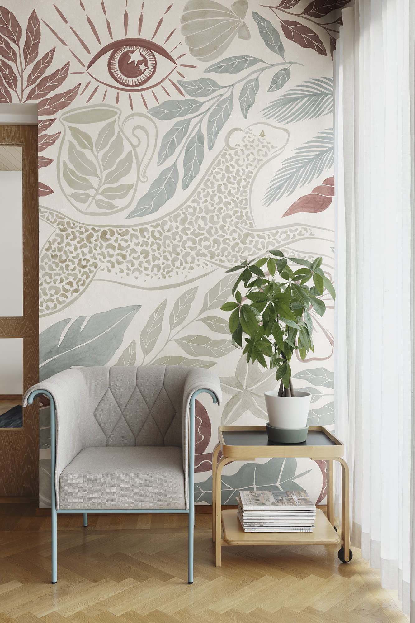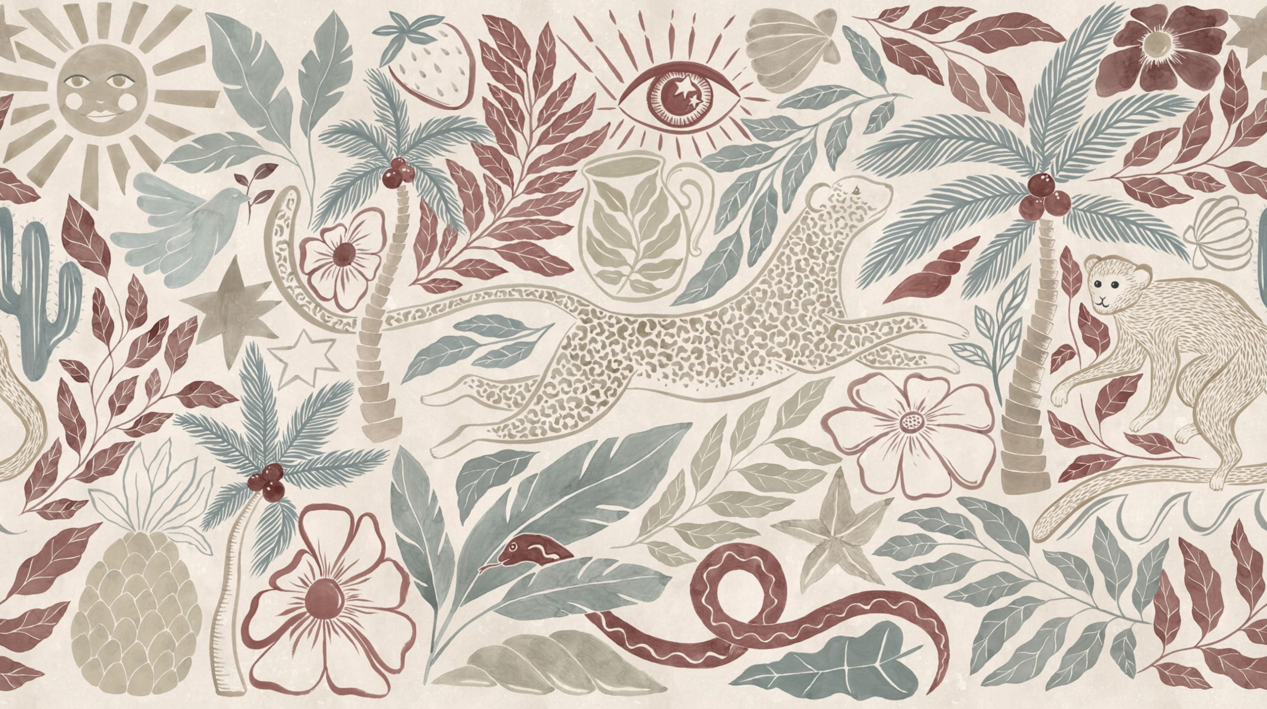 Intrați într-o oază de vis cu acest tapet pastel cu leoparzi, maimuțe, palmieri și elemente tropicale jucăușe. Culorile moi și desenele ciudate, inclusiv stele, ochi și motive solare, creează o evadare capricioasă chiar pe pereții dvs., îmbinând elemente de floră și faună pentru o estetică vibrantă și eclectică.
