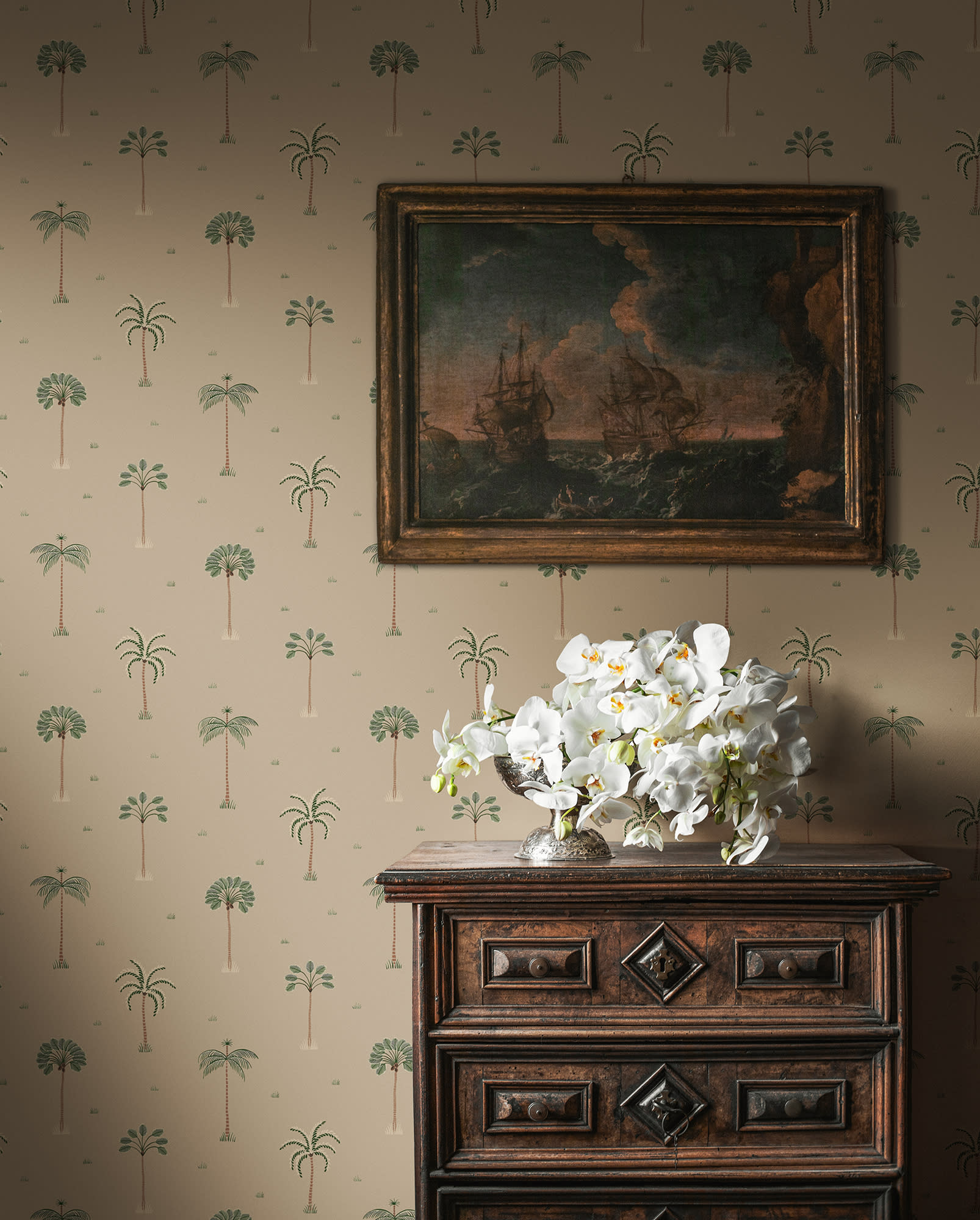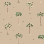 Ca mici ornamente, palmierii stilizați împodobesc cu mândrie acest tapet decorativ. Un model cu un aer jucăuș și exclusivist în același timp. Milo, Clay este așezat pe un fundal bogat de maro argilos, îmbunătățit cu nuanțe verzi luxuriante și bej complementare.