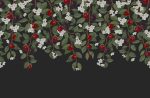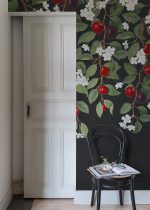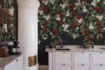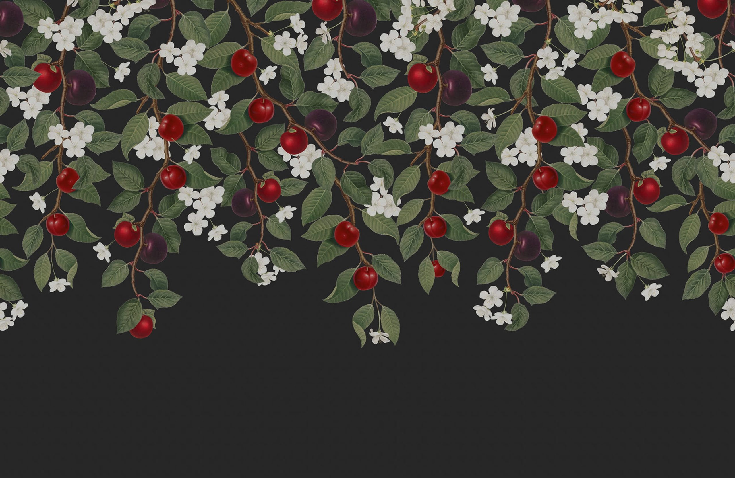 Prune coapte care se leagănă leneșe, atârnând de-a lungul peretelui. O ilustrație vintage drăguță cu pruni Mirabelle, frunze și flori albe. Varianta Midnight are un fundal negru care adaugă un contrast dramatic florilor albe și fructelor roșii.