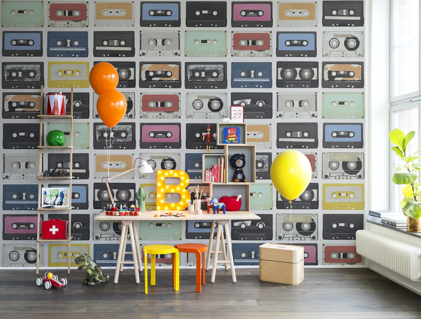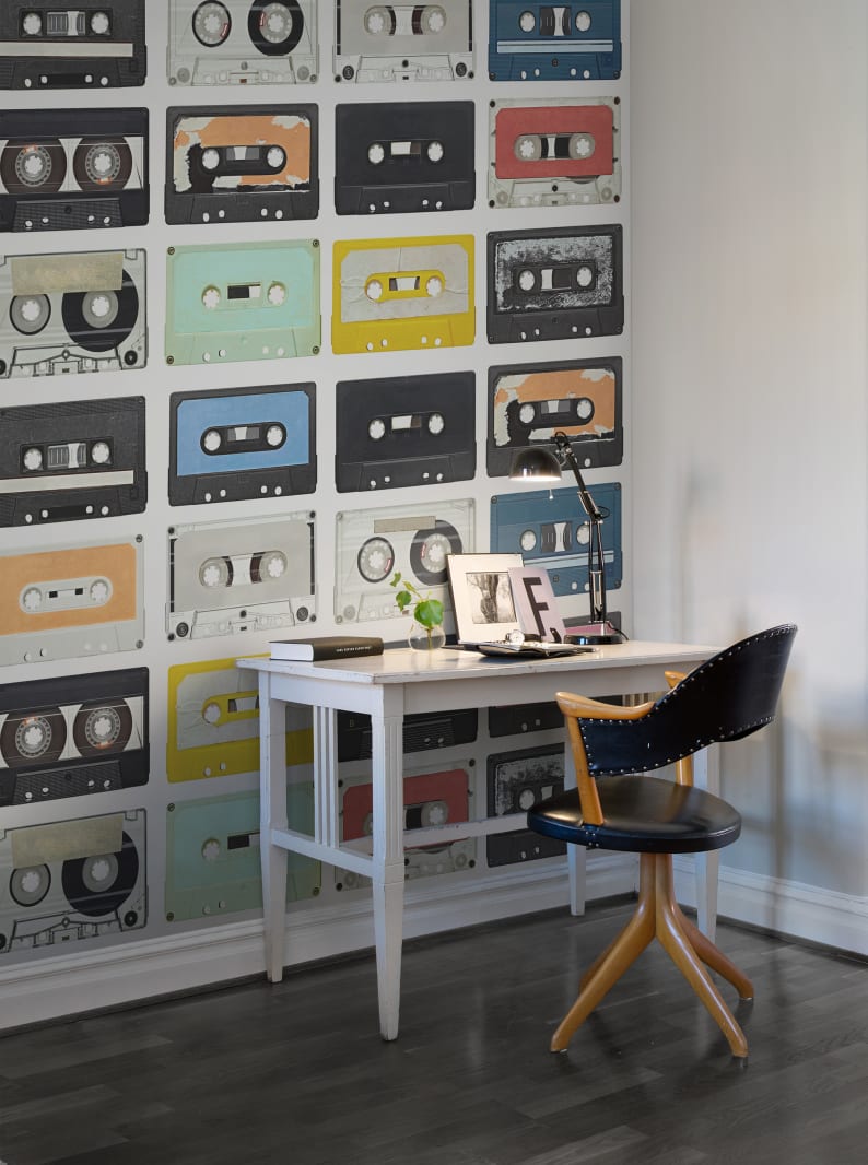 Muzica umple infinitul dintre două suflete – Rabindranath Tagore. Acest fototapet inspirat din arta pop acoperit de casete cu un aer retro, va aduce cu siguranță puțină energie în orice cameră.