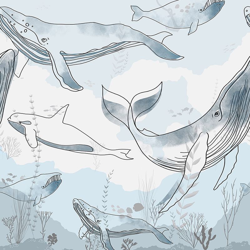 Acest tapet ilustrează o scenă marină captivantă, cu balene grațioase care înoată printr-un ocean albastru. Designul elegant, în nuanțe delicate de albastru și gri, aduce o senzație de calm și liniște în orice cameră. Tapetul este perfect pentru a crea o atmosferă relaxantă și visătoare, ideală pentru dormitorul copiilor sau pentru spații de relaxare. Cu detalii subtile și un design minimalist, tapetul va transforma orice perete într-o oază de liniște.