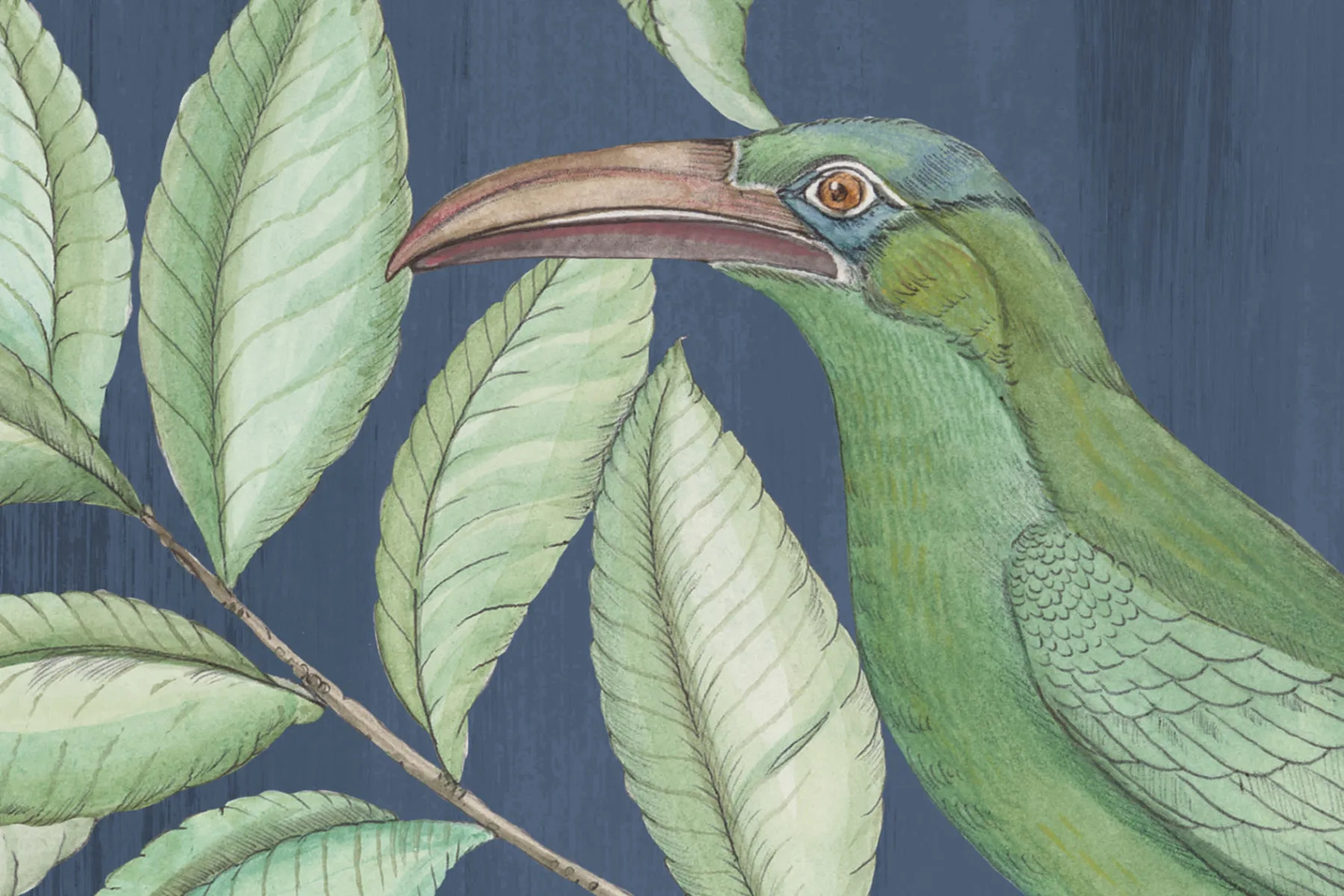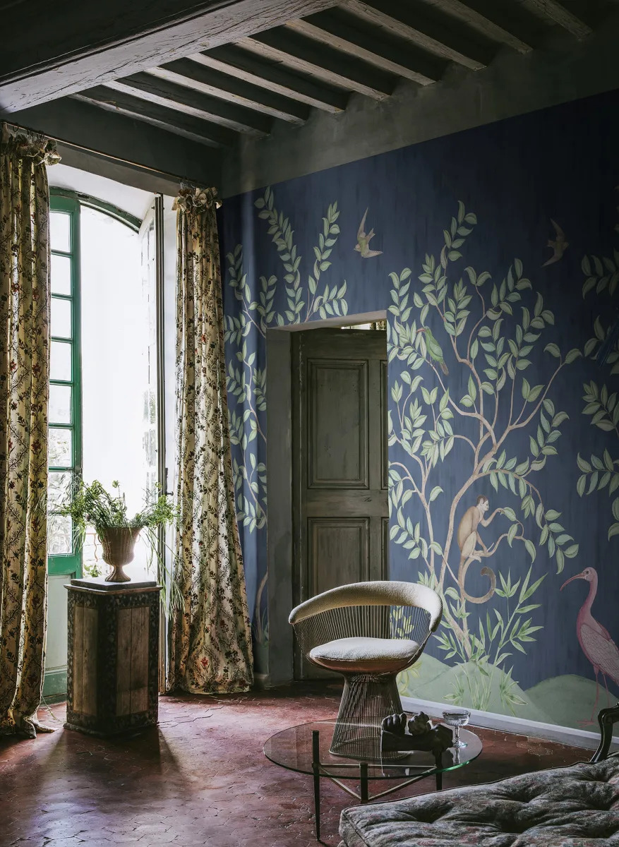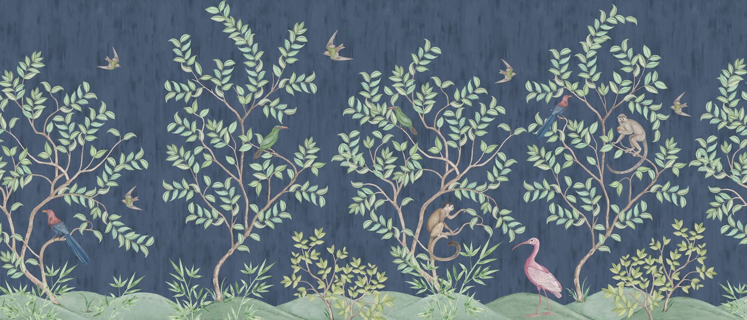 Monkeys Paradise este o pictură murală mare, îndrăzneață, inspirată de ceramica chinezească, cu păsări frumoase și vii și maimuțe jucăușe. Pictura murală este realizată de designerul de interior și pictorul Jack Kinsey. Varianta Dark Blue prezintă frunze verzi și animale colorate pe un fundal albastru închis, plin de viață.