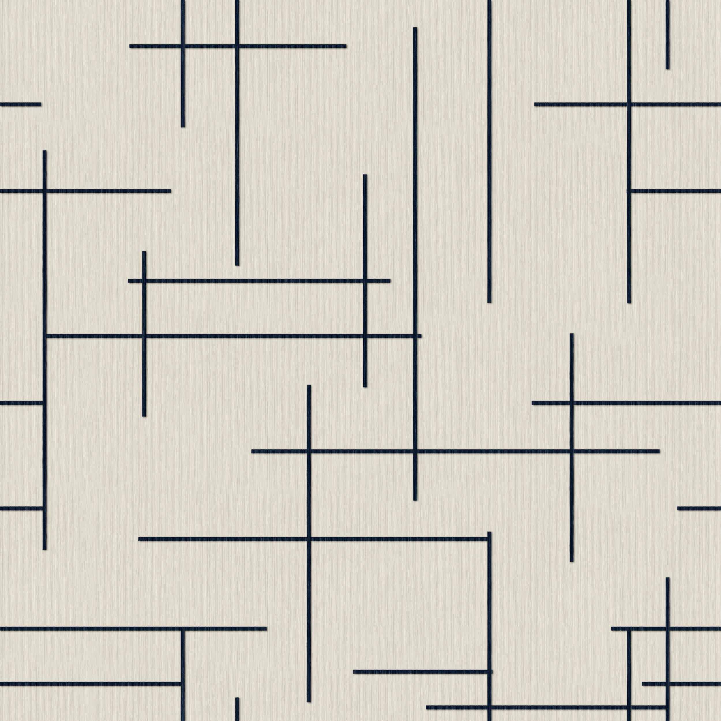 Acest tapet aduce un design geometric simplu, dar sofisticat, în orice cameră. Liniile fine, de culoare bleumarin, creează un contrast elegant cu fundalul neutru, oferind un aspect aerisit și contemporan. Ideal pentru un living modern sau un birou stilat.