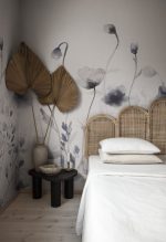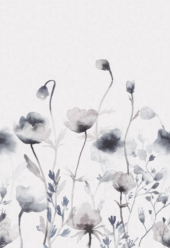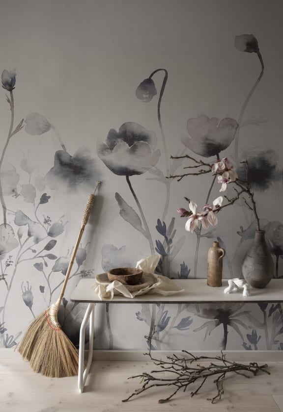 Florile de maci pictate manual înconjurate de capsule mari de semințe și rămurele simple creează impresia unei pajiști imense în care omul se pierde.