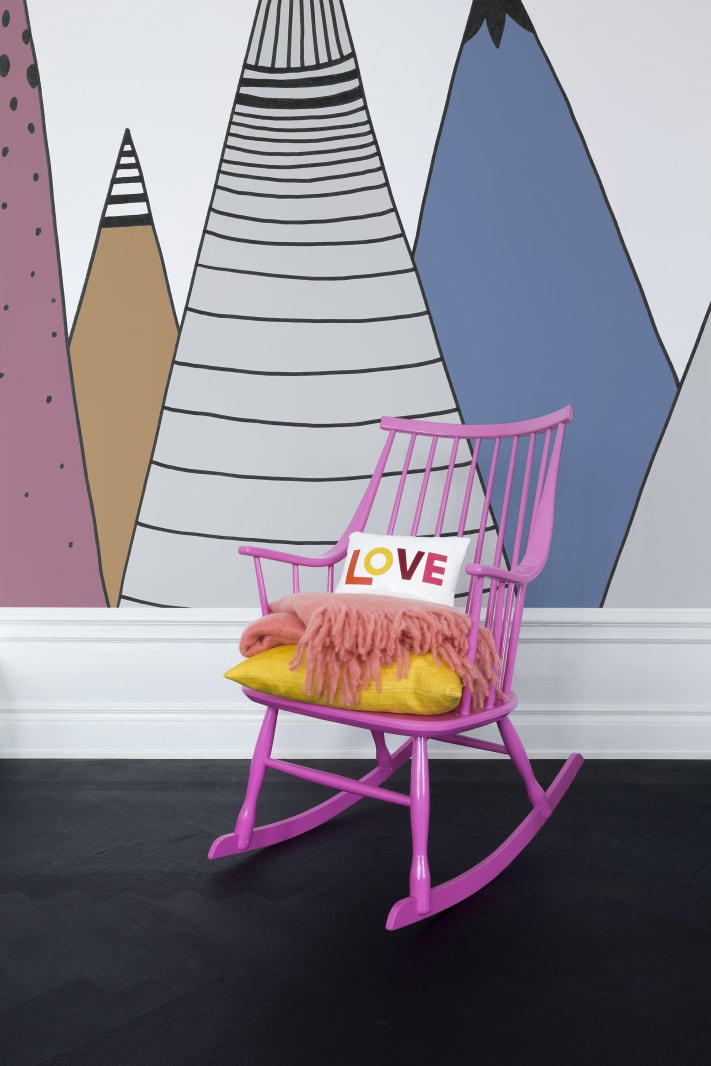 Un alt mod de a reprezenta un fototapet cu munți. În locul fotografiei noi am desenat creasta muntelui cu un marker. În versiunea aceasta, am colorat tiparul pentru a-l face și mai jucăuș.