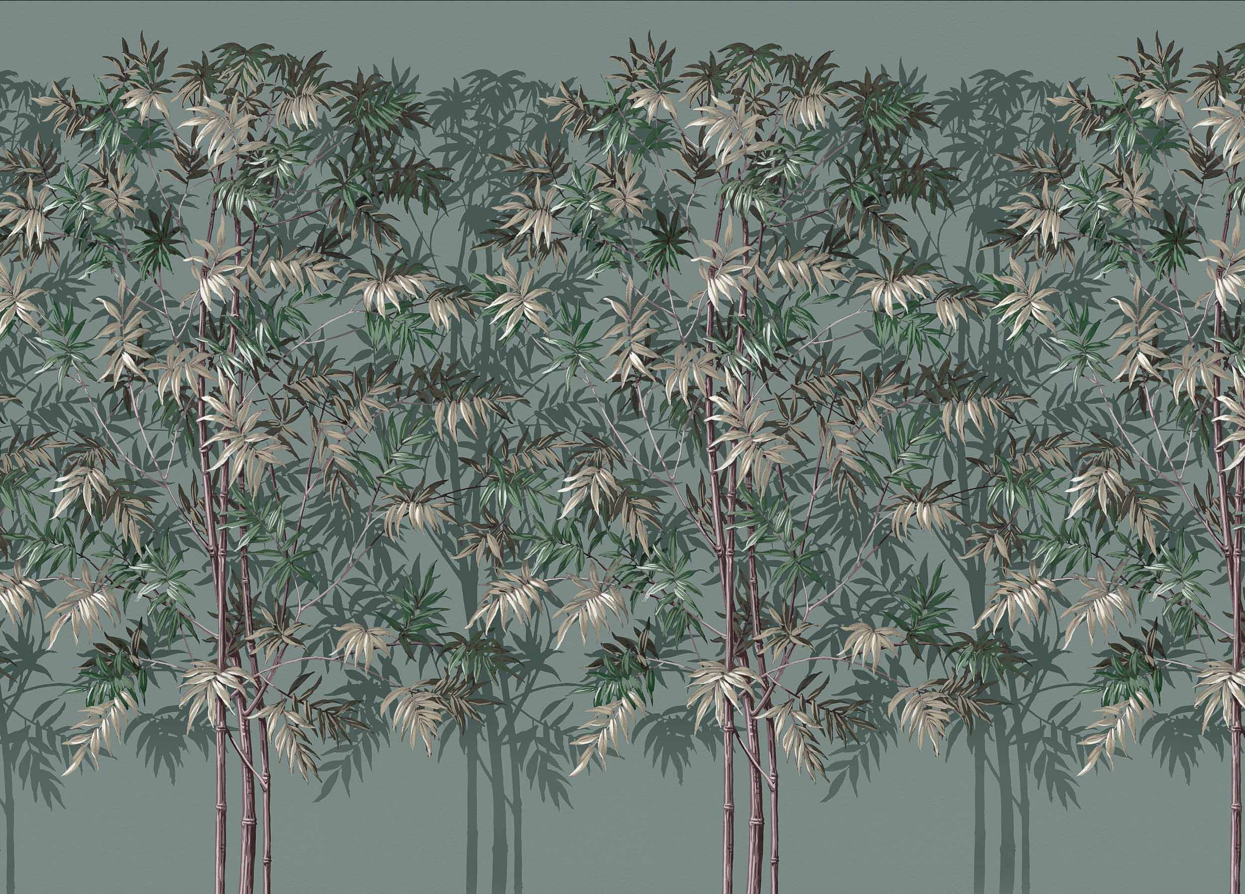 Tulpinile bogate de bambus se înalță într-o pădure mitică, ca într-o poveste de basm. Soarele strălucește printre frunze, creând o paletă de culori incredibilă.